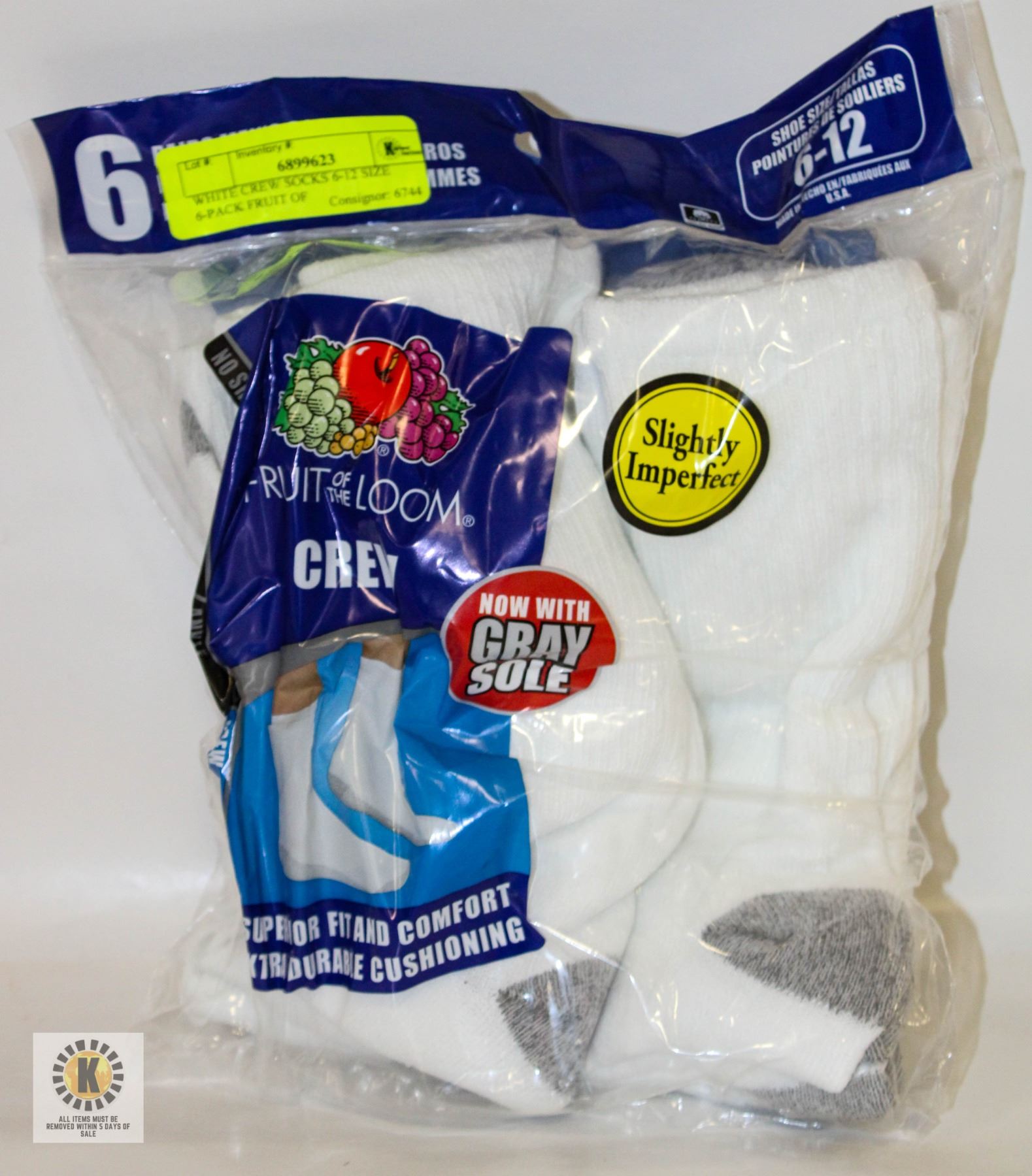WHITE CREW SOCKS 6-12 SIZE 6-PACK FRUIT OF