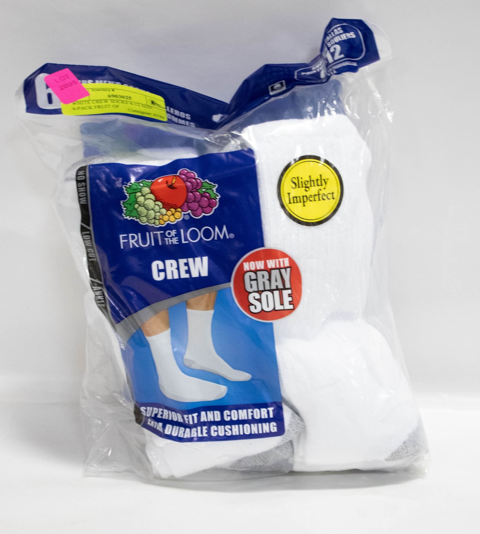 WHITE CREW SOCKS 6-12 SIZE 6-PACK FRUIT OF