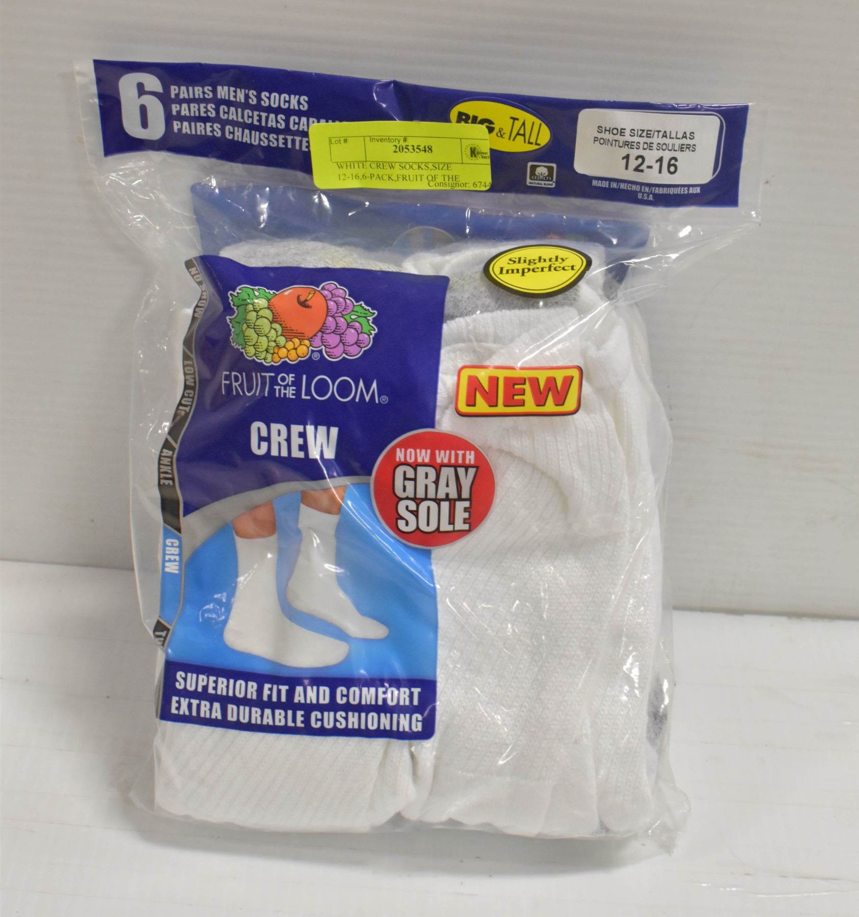 WHITE CREW SOCKS,SIZE 12-16,6-PACK,FRUIT OF THE