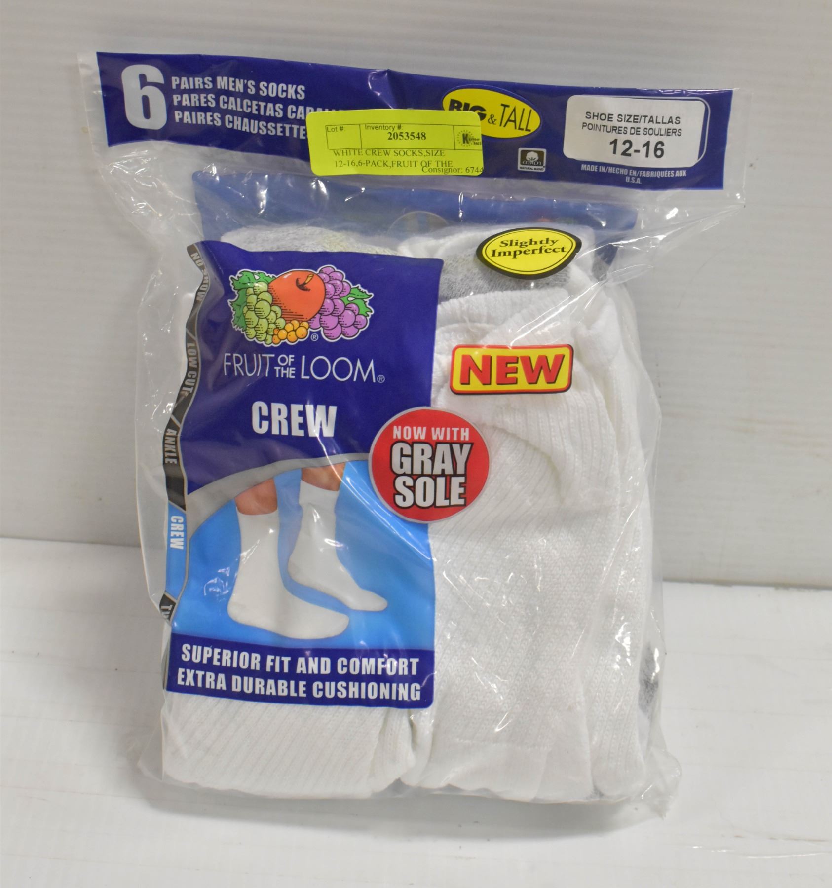 WHITE CREW SOCKS,SIZE 12-16,6-PACK,FRUIT OF THE