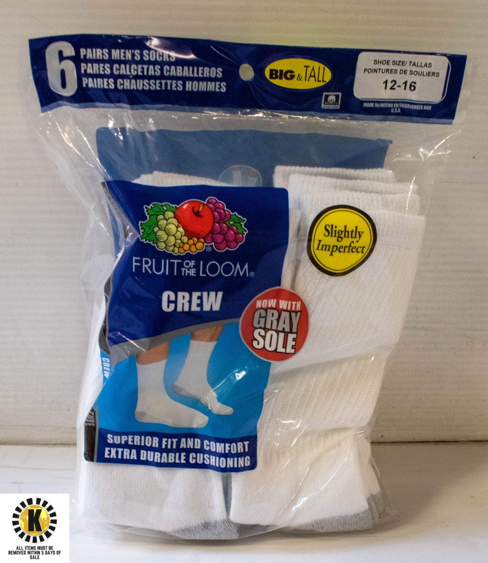 WHITE CREW SOCKS,SIZE 12-16,6-PACK,FRUIT OF THE