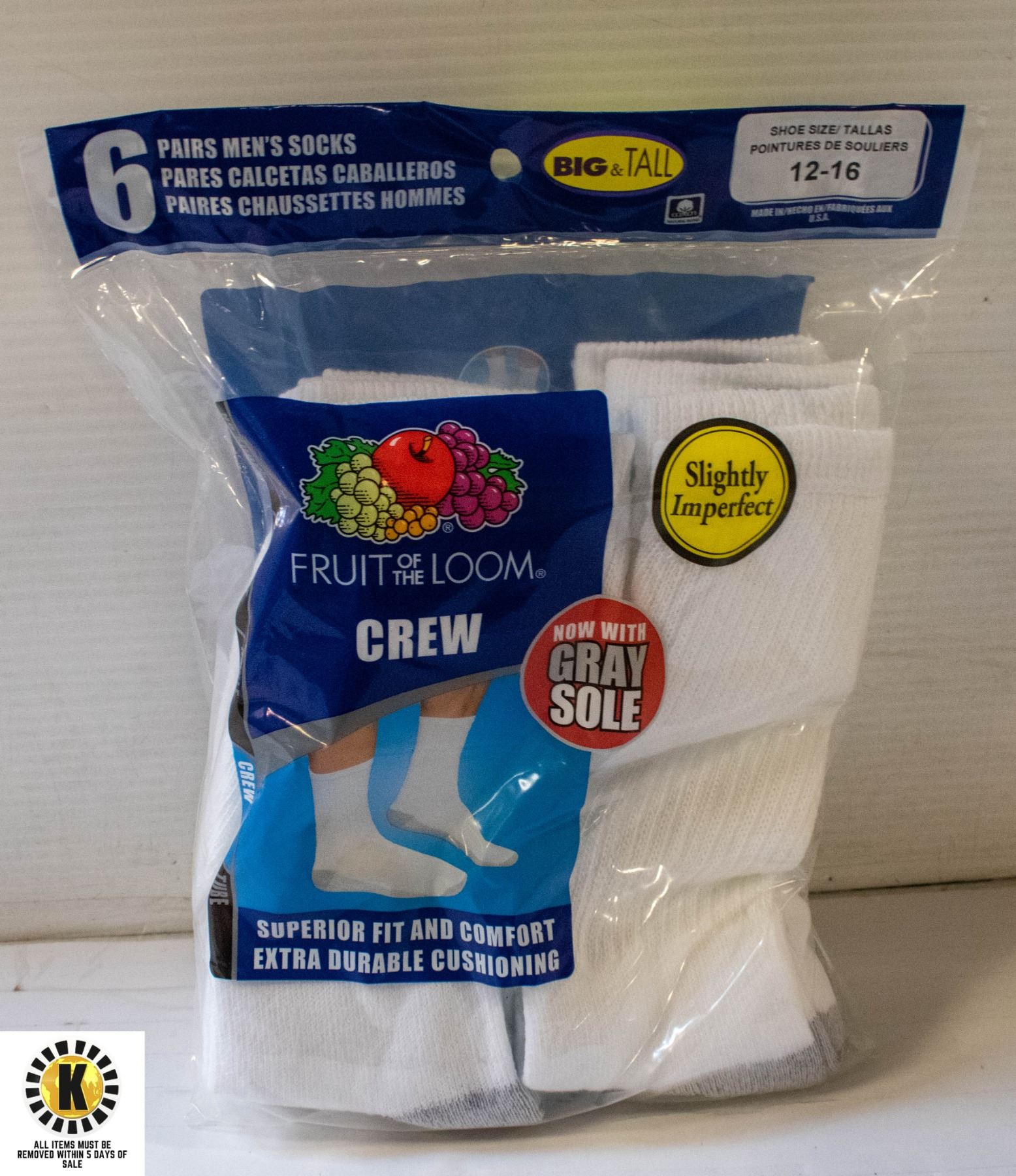 WHITE CREW SOCKS,SIZE 12-16,6-PACK,FRUIT OF THE
