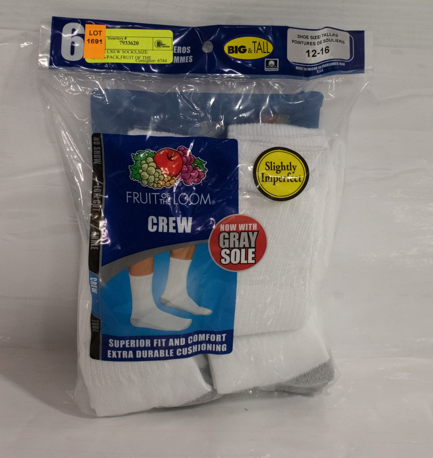 WHITE CREW SOCKS,SIZE 12-16,6-PACK,FRUIT OF THE