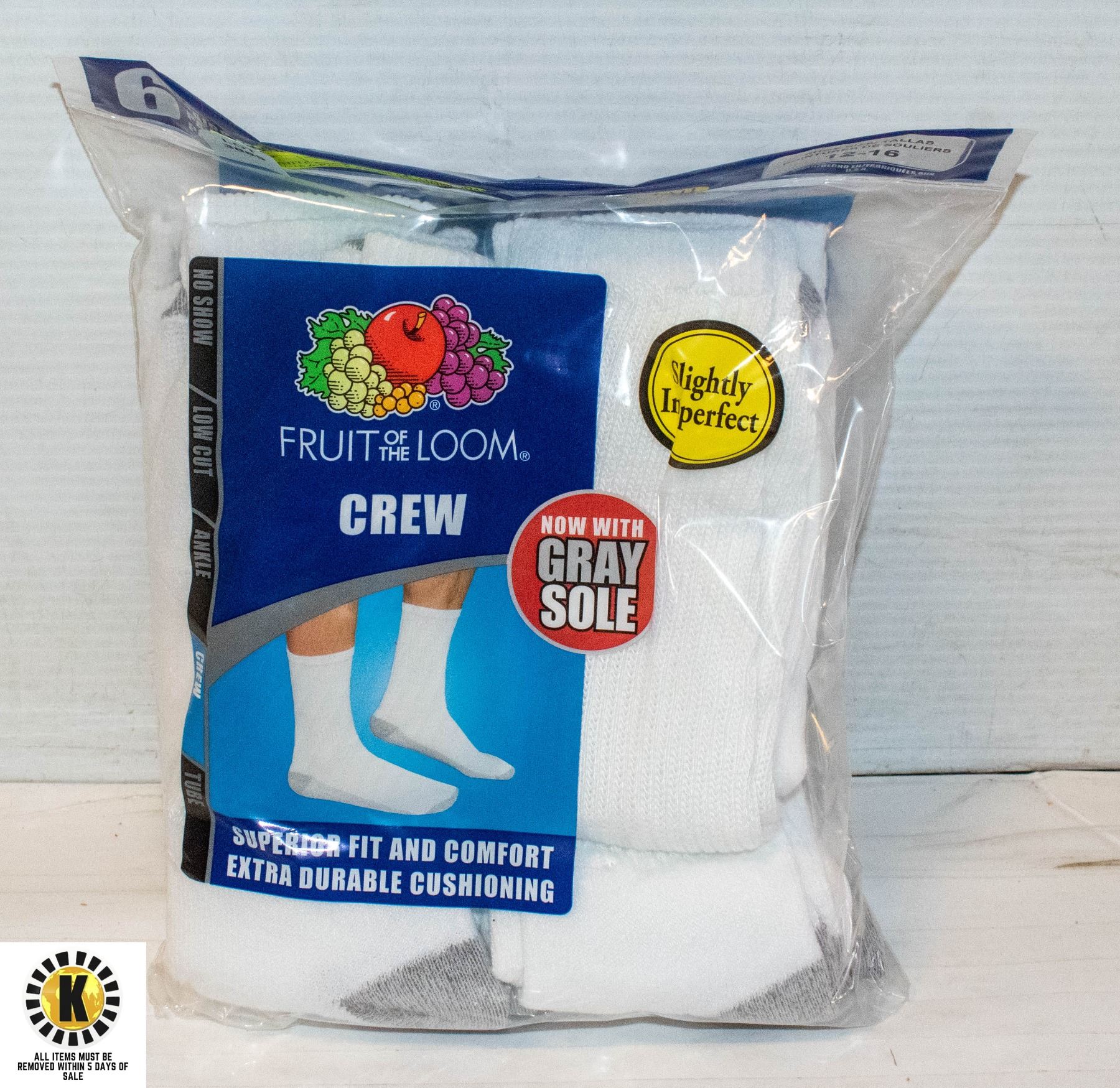 WHITE CREW SOCKS,SIZE 12-16,6-PACK,FRUIT OF THE