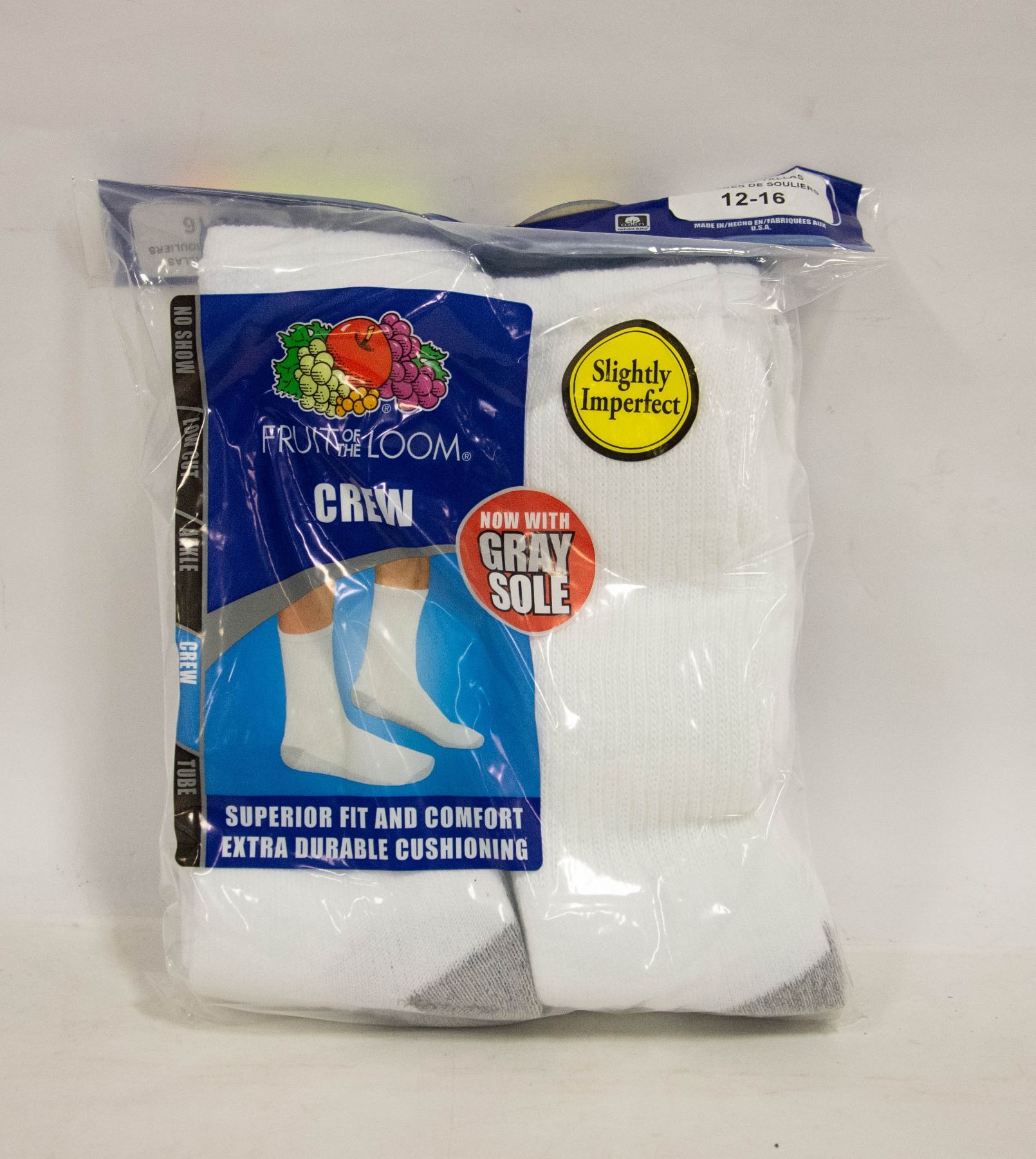 WHITE CREW SOCKS,SIZE 12-16,6-PACK,FRUIT OF THE