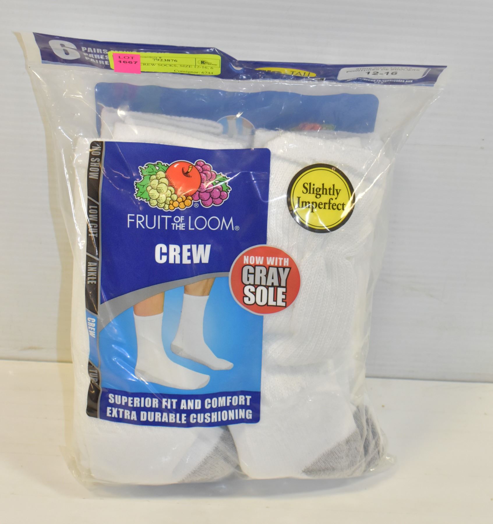 WHITE CREW SOCKS, SIZE 12-16, 6 PACK