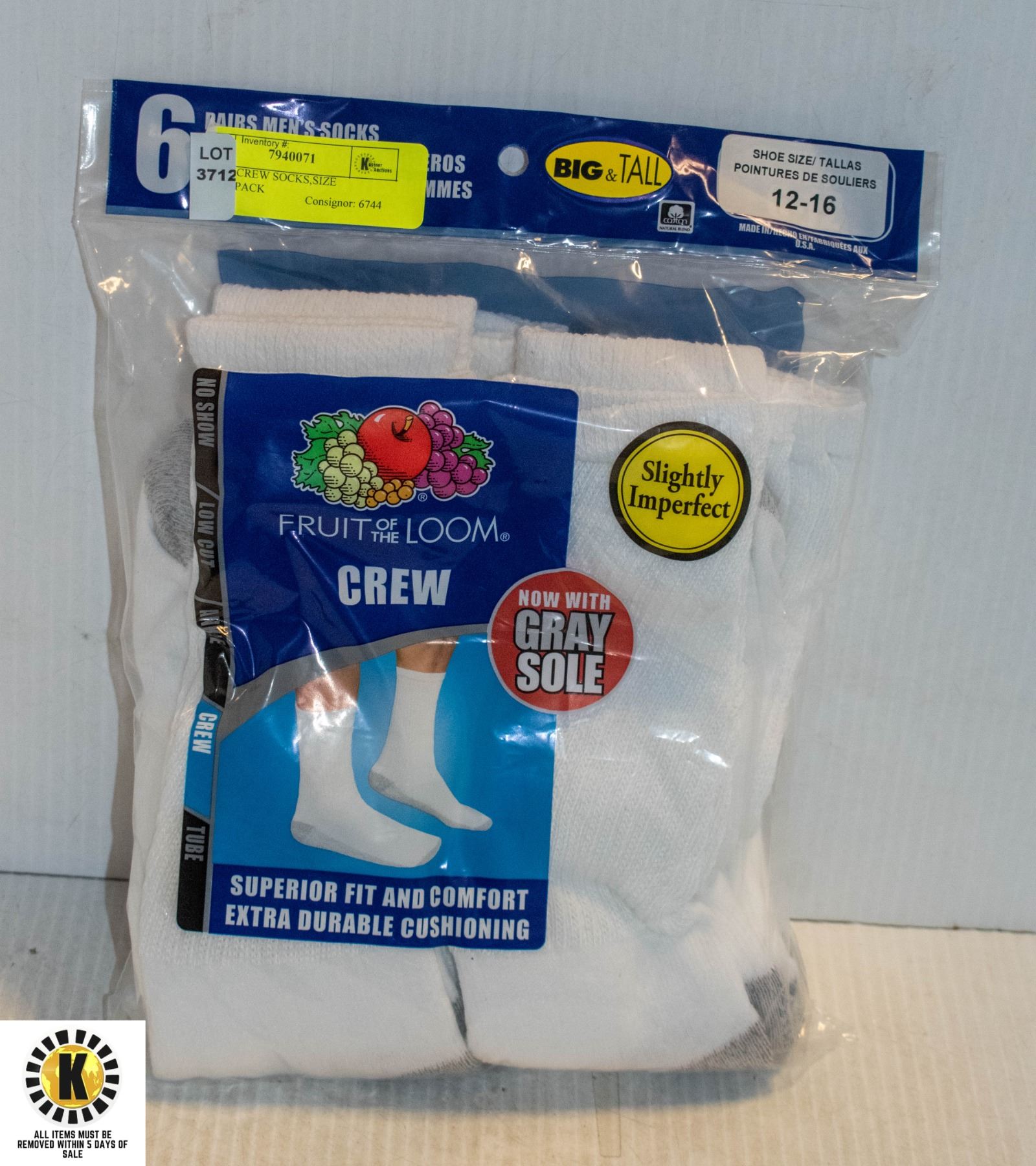 WHITE CREW SOCKS,SIZE 12-16,6-PACK
