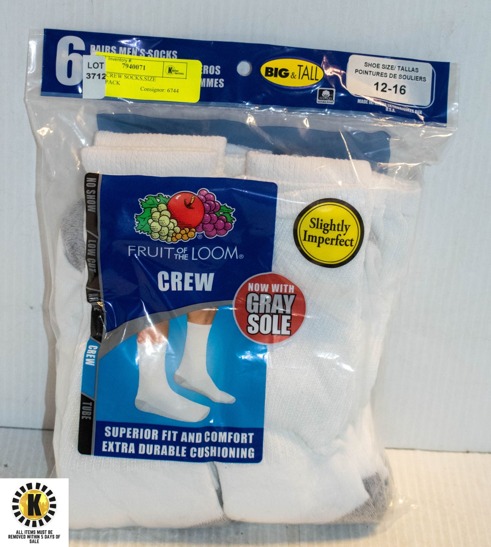 WHITE CREW SOCKS,SIZE 12-16,6-PACK