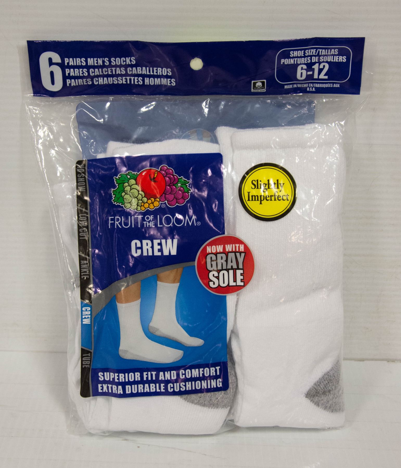 WHITE CREW SOCKS,SIZE 6-12,6-PACK,FRUIT OF THE