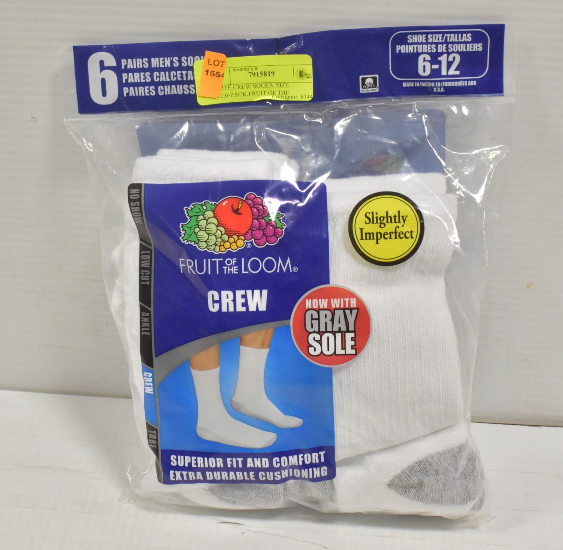 WHITE CREW SOCKS, SIZE 6-12,6-PACK,FRUIT OF THE