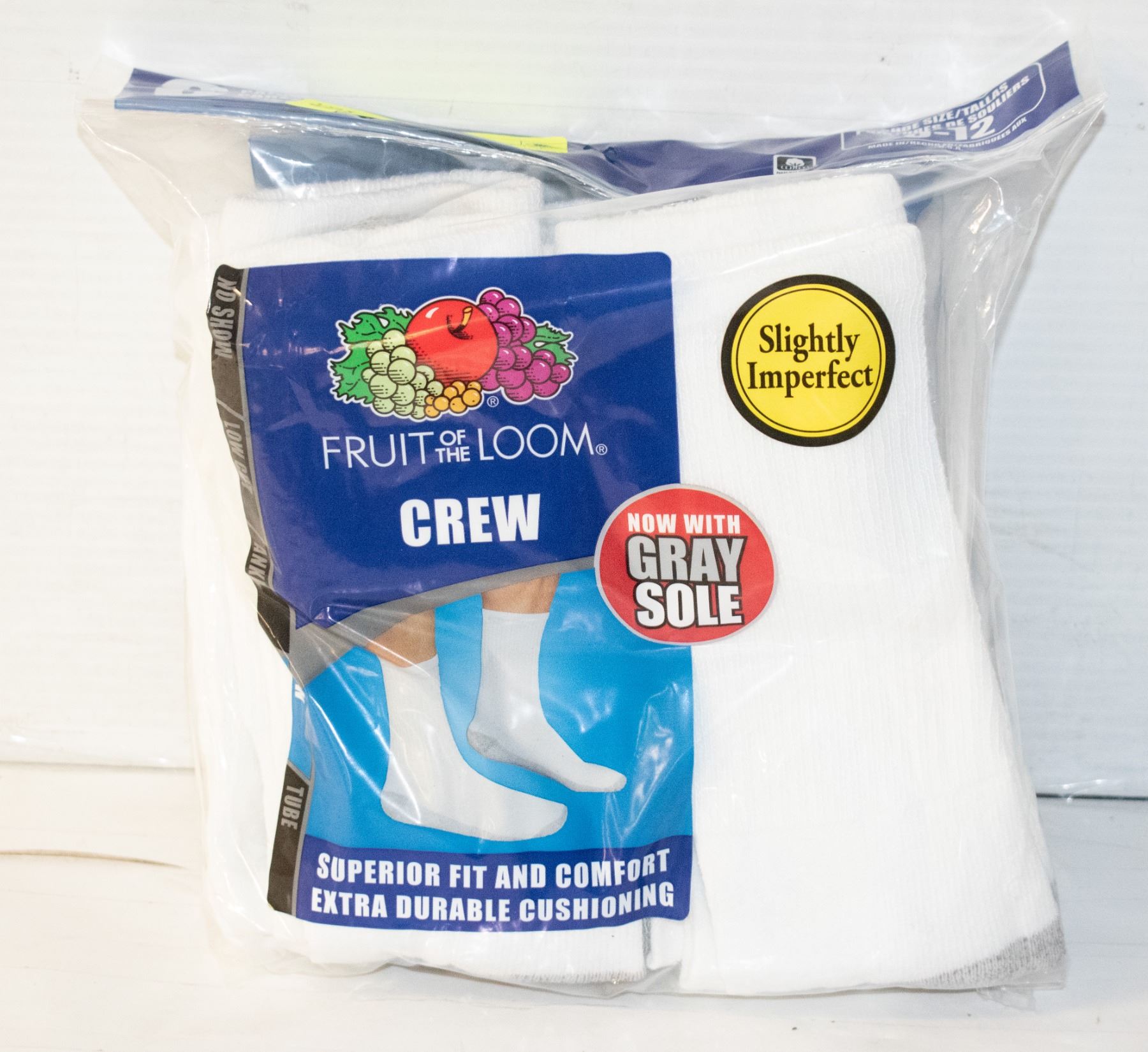 WHITE CREW SOCKS,SIZE 6-12,6 PACK,FRUIT OF THE