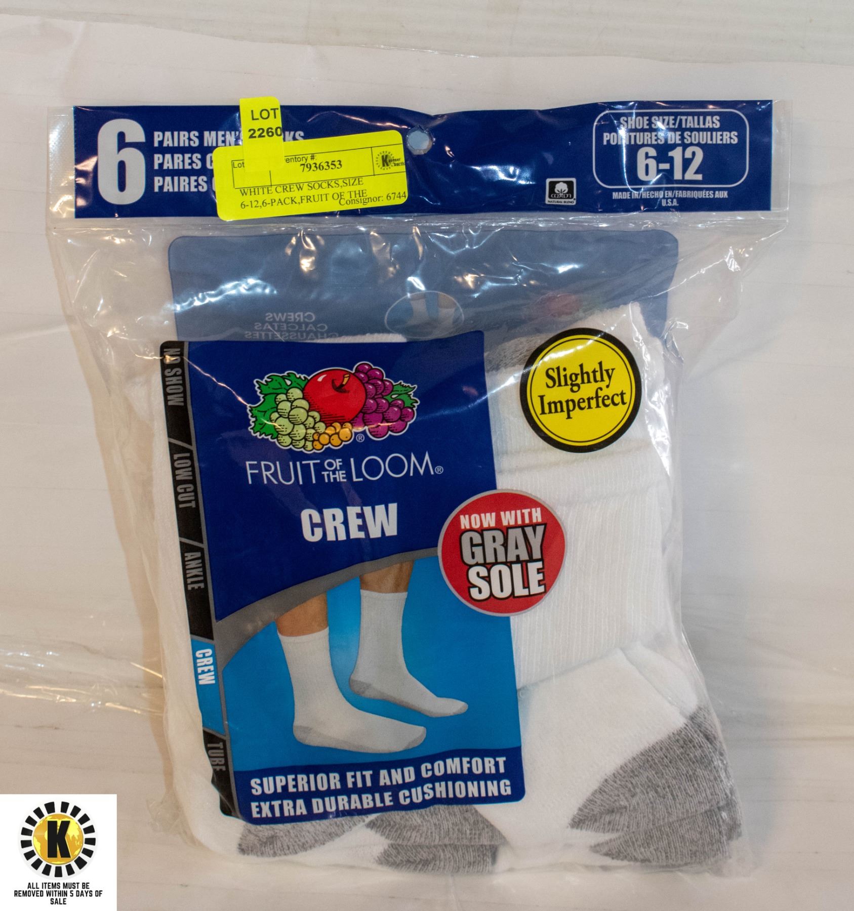 WHITE CREW SOCKS,SIZE 6-12,6-PACK,FRUIT OF THE