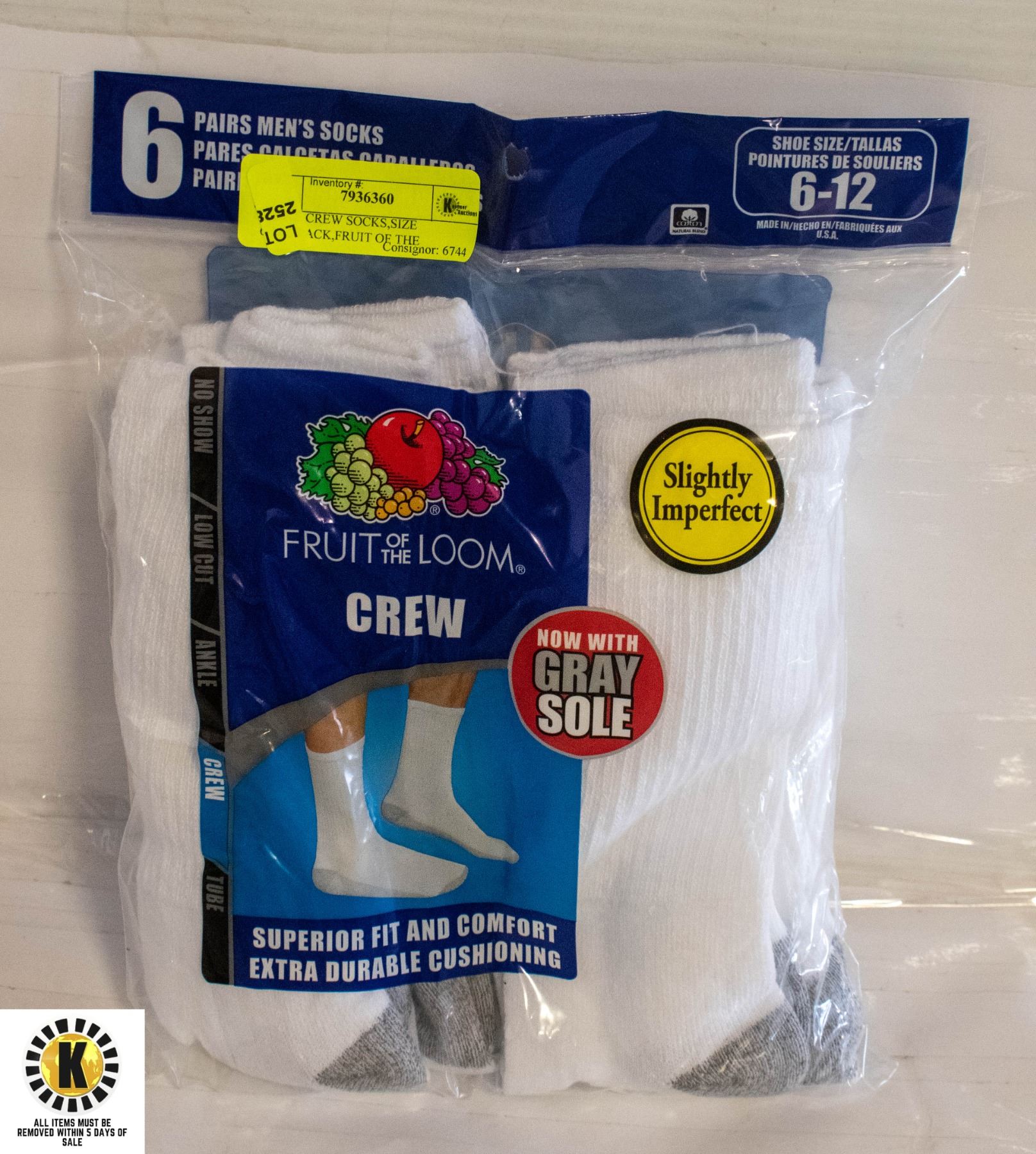 WHITE CREW SOCKS,SIZE 6-12,6-PACK,FRUIT OF THE