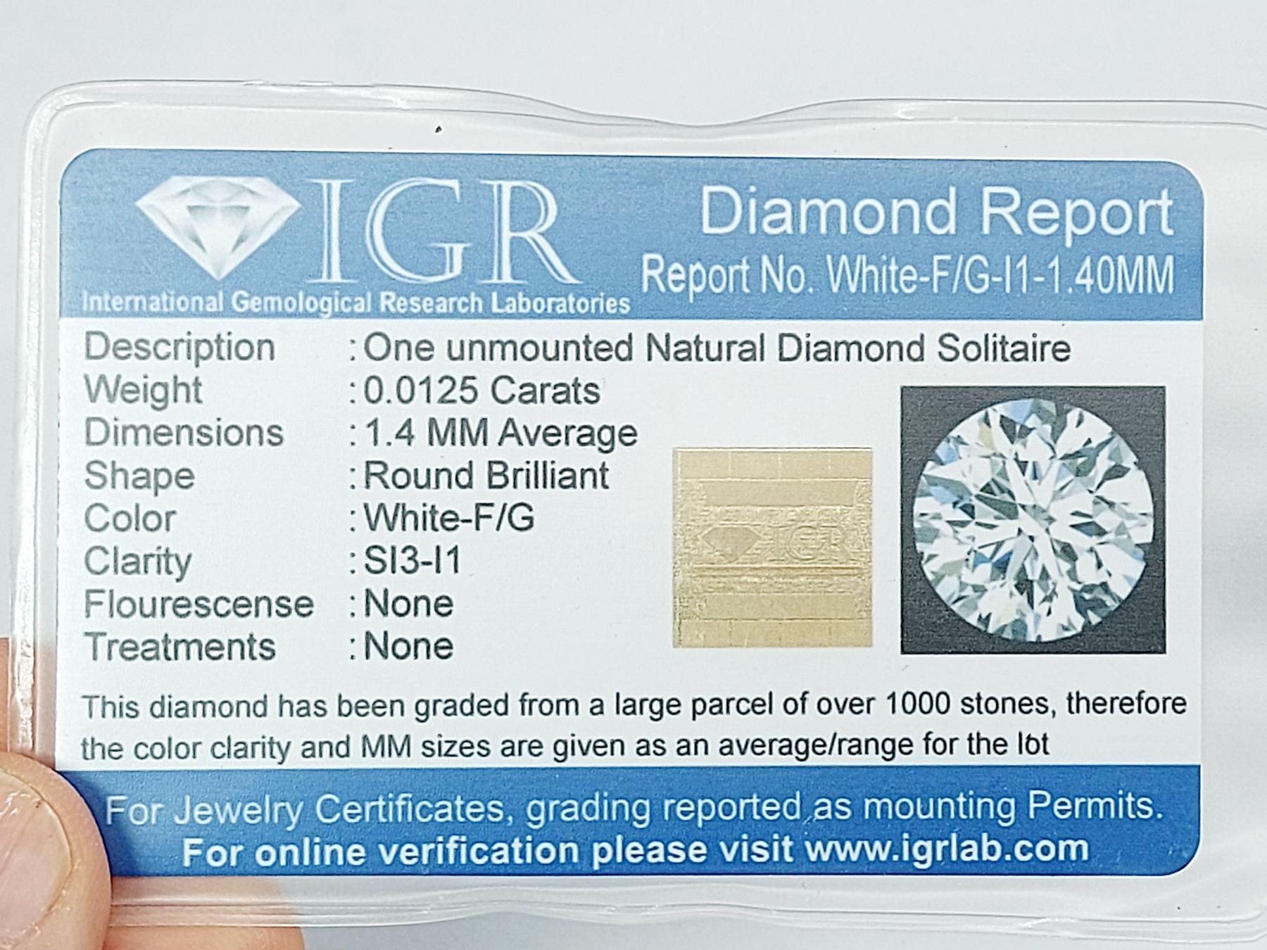 0.0125 ct. 1.4 mm. Colour: White - F/G , Shape: Round (Brilliant) Cut, Clarity: SI3- I1 , HPHT Treatment