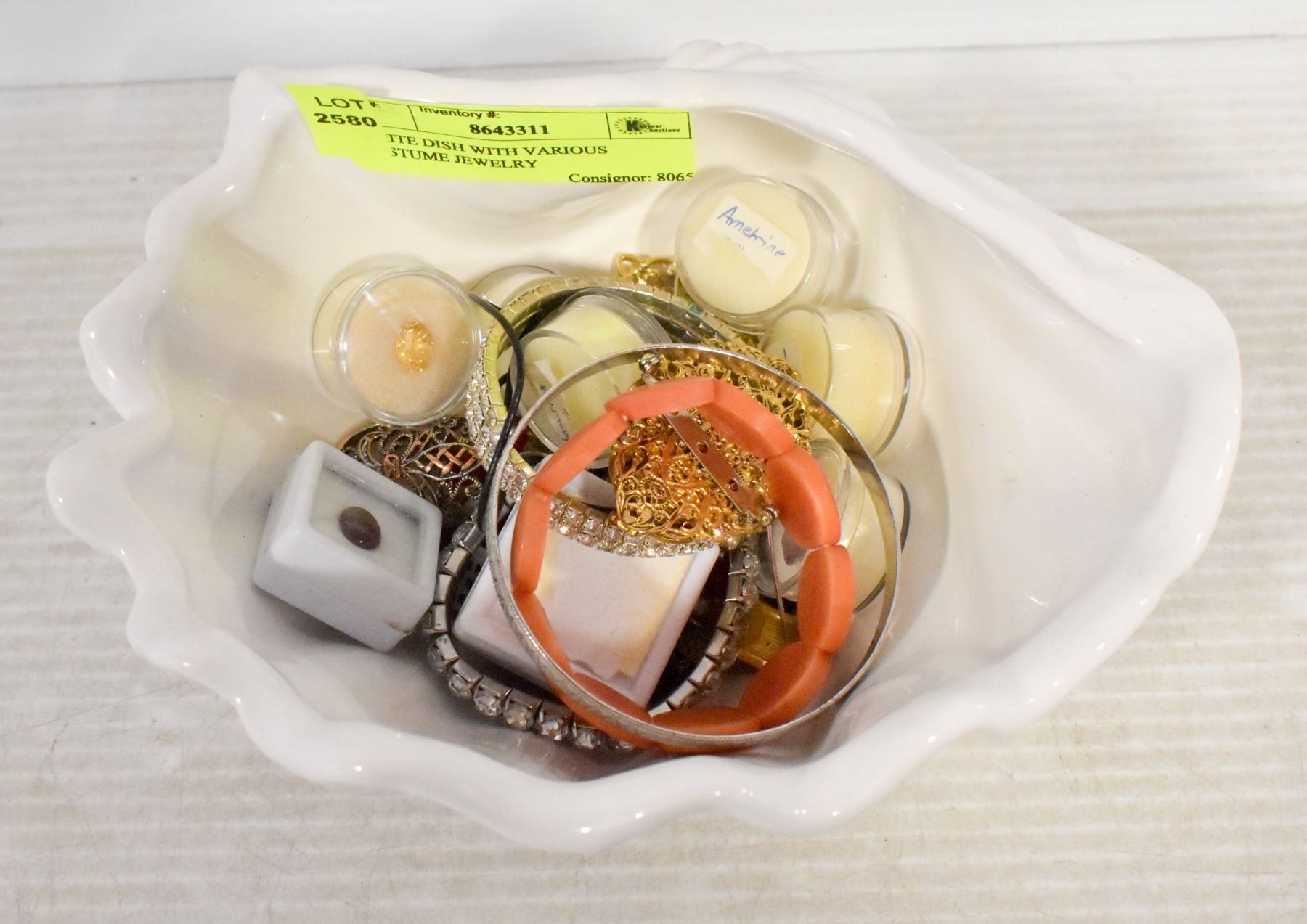 WHITE DISH WITH VARIOUS COSTUME JEWELRY