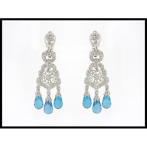 Here is the work of a master goldsmith whose long hours of labor have all been worth the effort. He has formed 18K solid white gold as only a master could. These topaz and diamond earrings weigh 7.50 grams. 6 natural blue topaz gems weigh a total of 9.30 carats. 80 diamonds weigh at least 2/3 carats. The earrings dangle 47mm (1 7/8") long. Topazes are a beautiful deep swimming pool blue color. Diamonds sparkle, as diamonds should. These are filigree dangles that are sexy. Even the $2,000.00 store price was great value, but now to be yours for a small fraction.