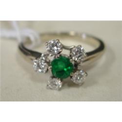 14 KT WHITE GOLD EMERALD & DIAMOND RING. Contains approx. 1/2 ct. round emerald in center, medium dark green & fair clarity. Also contains approx. .50 ct. t.w. of diamonds, 5-.10 ct. round diamonds. VS2 clarity & H color. 3.6 grams wt. (CAGA appraisal).
