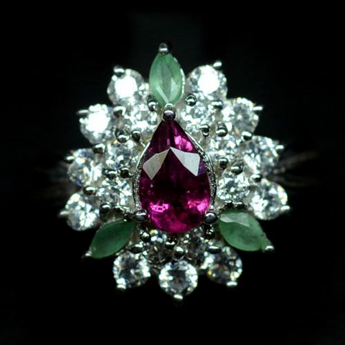 WHITE GOLD OVER STERLING SILVER EMERALD, RUBELLITE RING