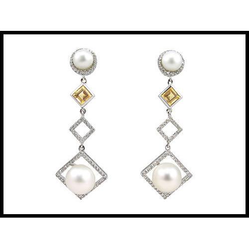 18K solid white gold earrings are set with AAA quality cultured pearls, 148 sparkling diamonds and 2 lovely citrine gems. The largest pearls are 9mm. The earrings weigh 8.61 grams, and are 44mm (1-3/4") long. Were priced for $1.450.00
