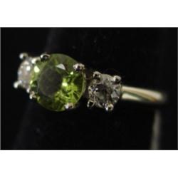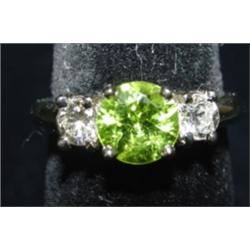 14 KT WHITE GOLD RING. Contains approx. 1.25 ct. round peridot (7mm wide) & 2 diamonds on sides with approx. .50 ct. t.w. SI clarity & I color. 5.3 grams. (CAGA appraisal).