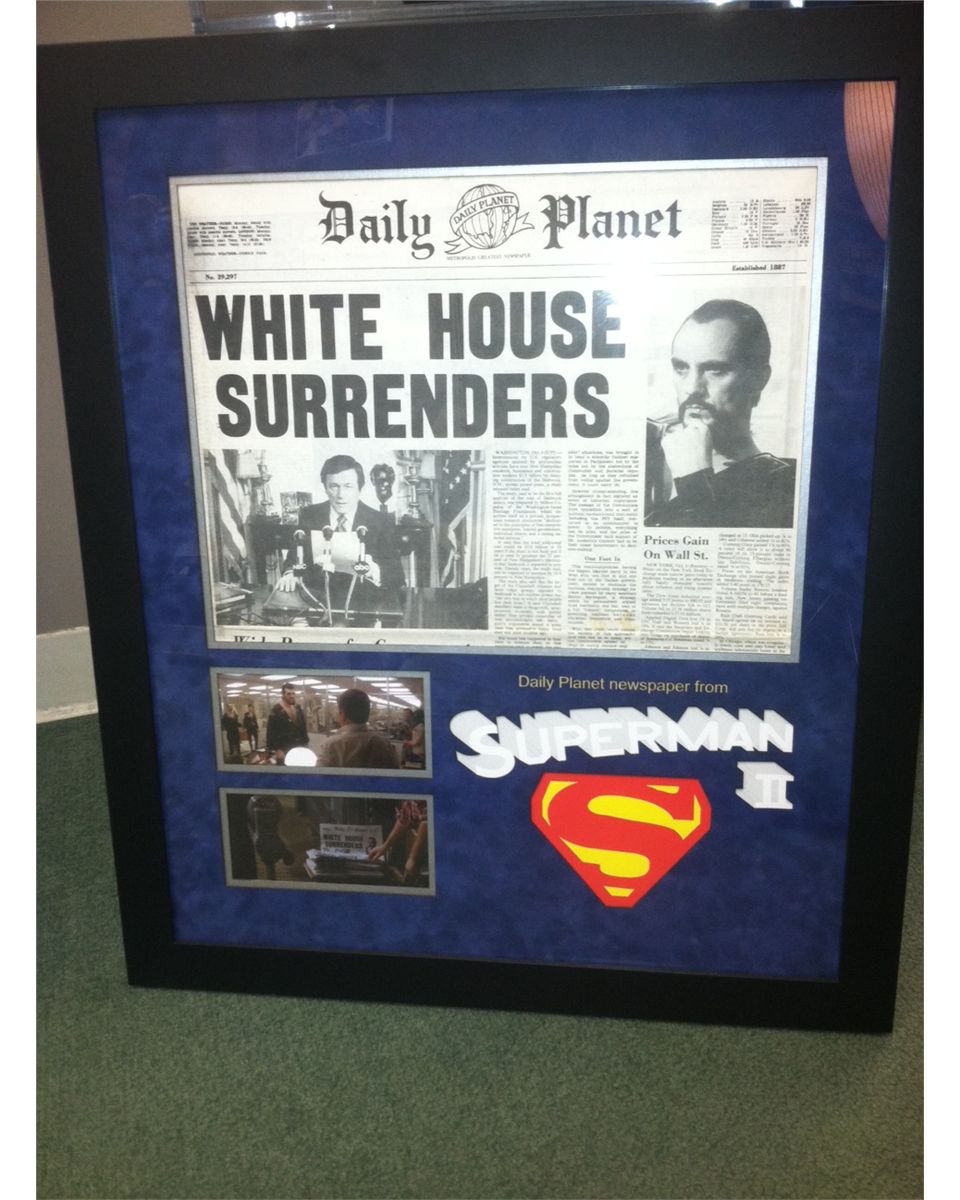Offered here is a Screen Used newspaper framed up in a nice display from superman 2. It shows a great pic of Terrence stamp as Zod.