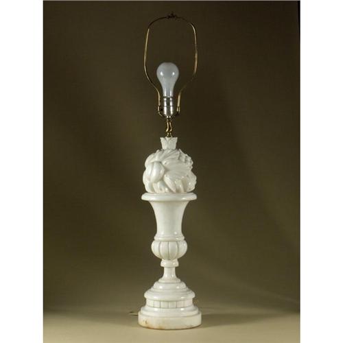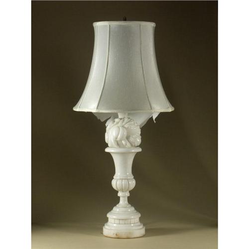 MARBLE LAMP: Polished white marble table lamp, stylized fruit in urn, 24'' without shade and harp, silk ''Grabel of California'' shade as seen, works electrically, ''Leviton'' fixture, some fleabites noted to base.