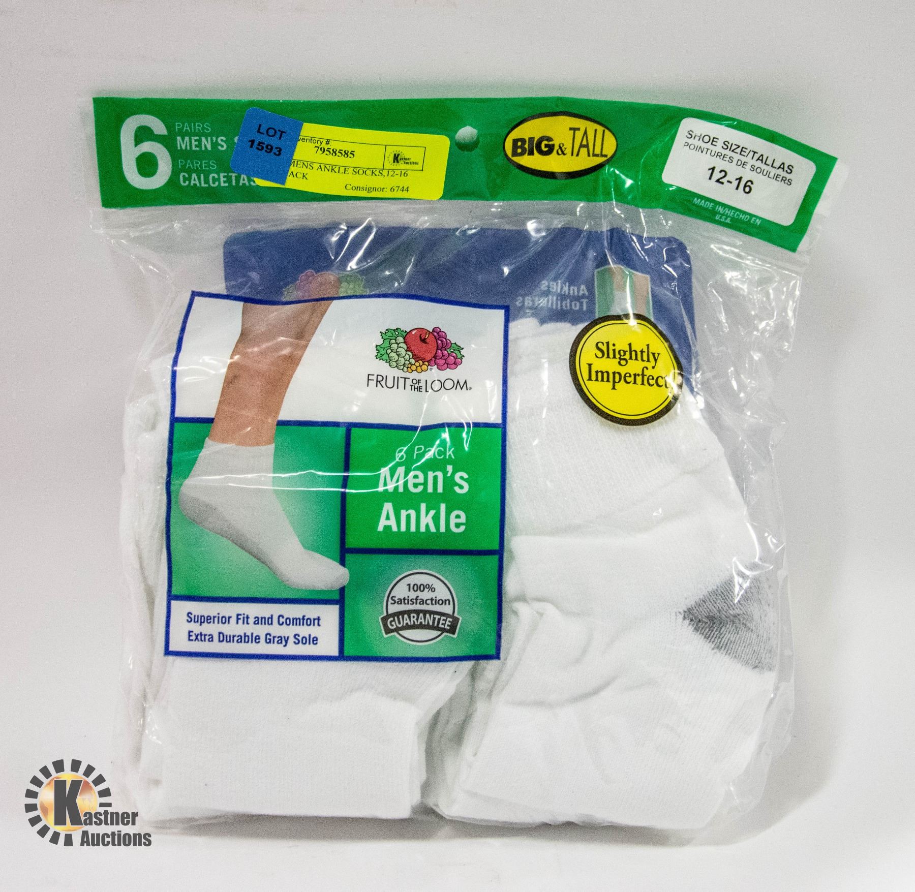 WHITE MENS ANKLE SOCKS,12-16 SIZE,6-PACK