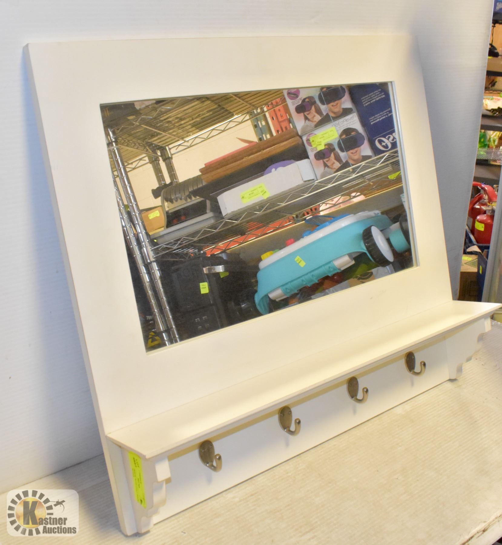 WHITE MIRROR WITH COAT HOOKS 25 X 22.5 INCHES