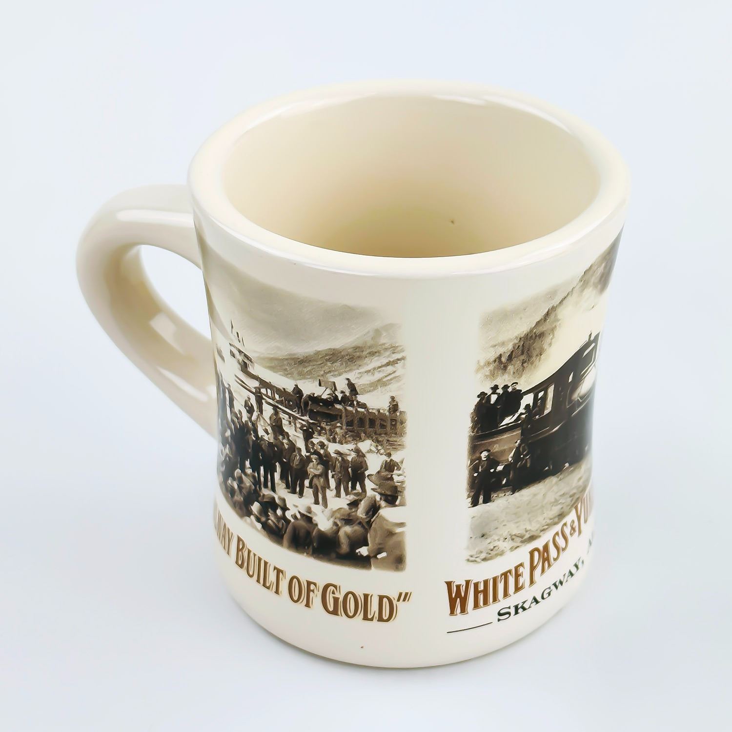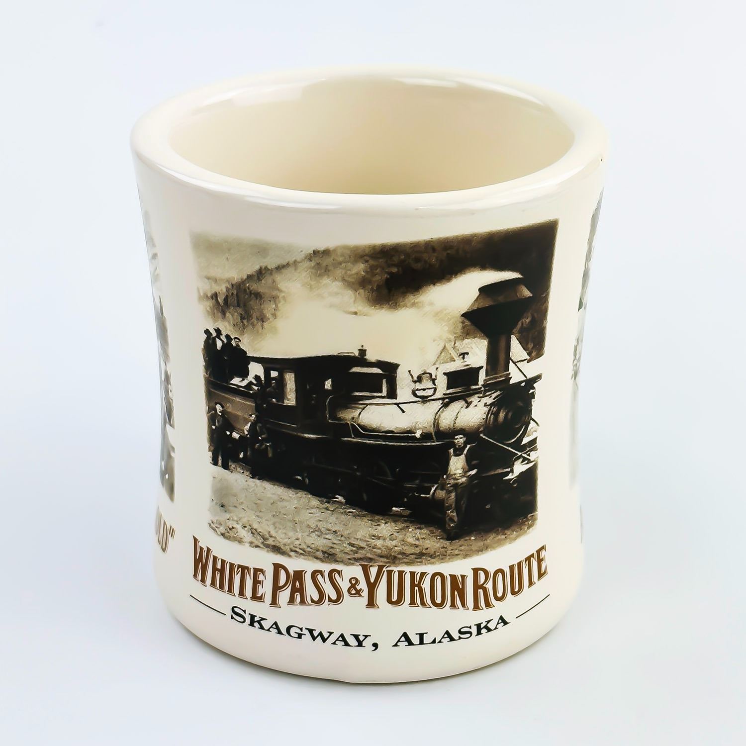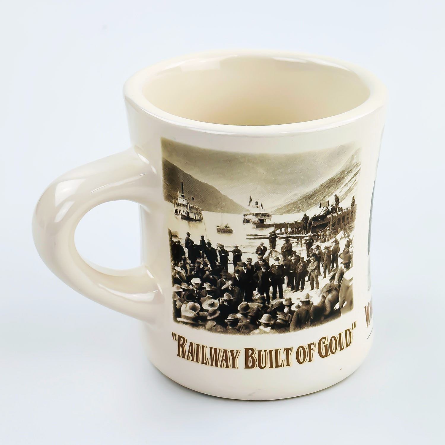 #8550 - WHITE PASS & YUKON ROUTE RAILWAY THEMED MUG CUP. MUG IS A THICK RESTAURANT WARE STYLE CUP. MEASURES: 4.75” (12 CM) WIDE - INCLUDES HANDLE BY 3.5” (9 CM) DIAMETER AND 3.75” (9.5 CM) HIGH