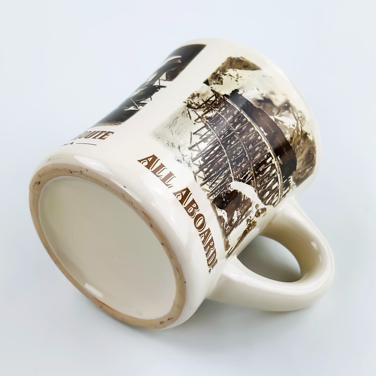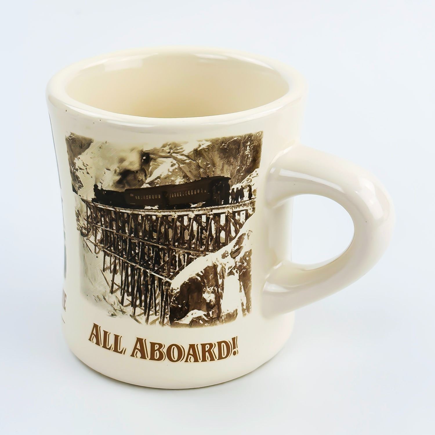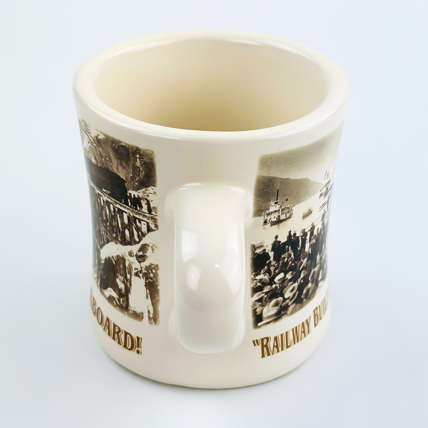#8550 - WHITE PASS & YUKON ROUTE RAILWAY THEMED MUG CUP. MUG IS A THICK RESTAURANT WARE STYLE CUP. MEASURES: 4.75” (12 CM) WIDE - INCLUDES HANDLE BY 3.5” (9 CM) DIAMETER AND 3.75” (9.5 CM) HIGH