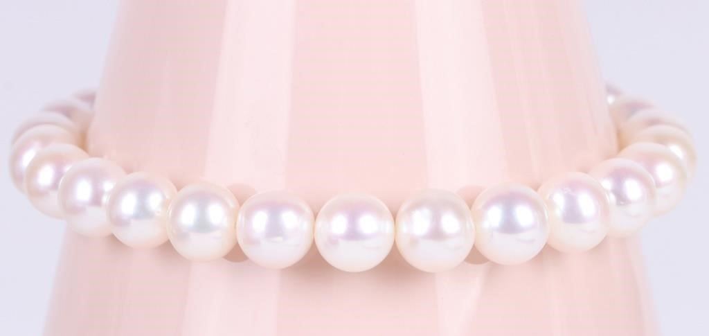 White pearl sterling silver matching ladies set to include one bracelet, one necklace, one ring, and one pair of stud earrings.