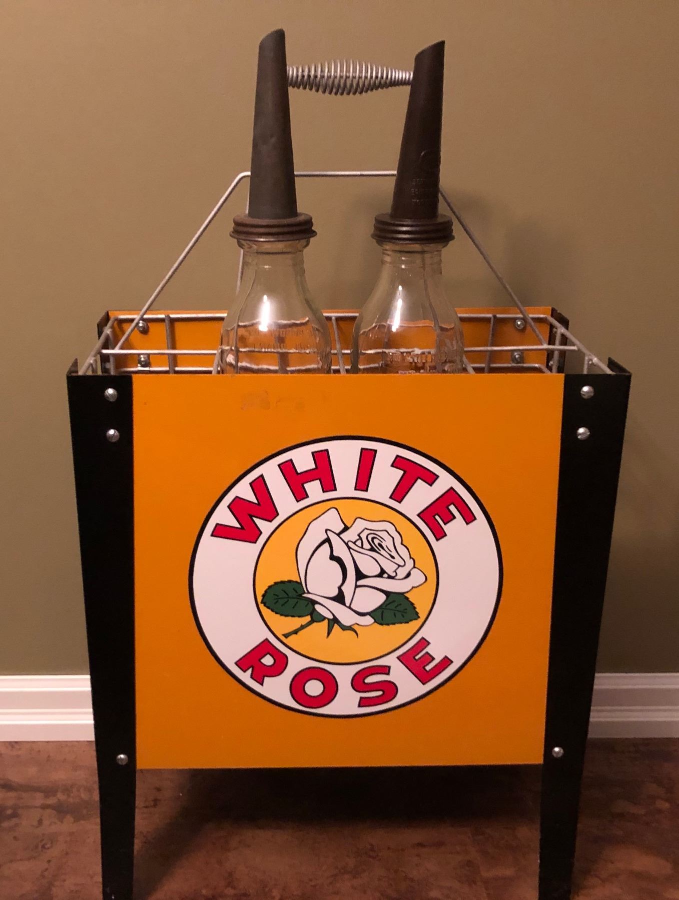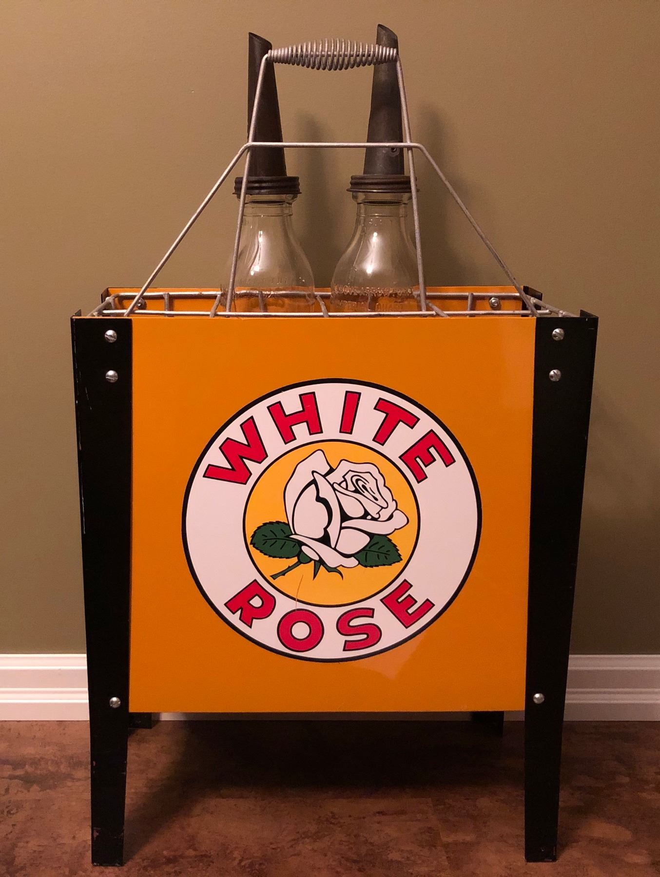 WHITE ROSE OIL BOTTLE RACK W / 2 X SPOUTED OIL BOTTLES