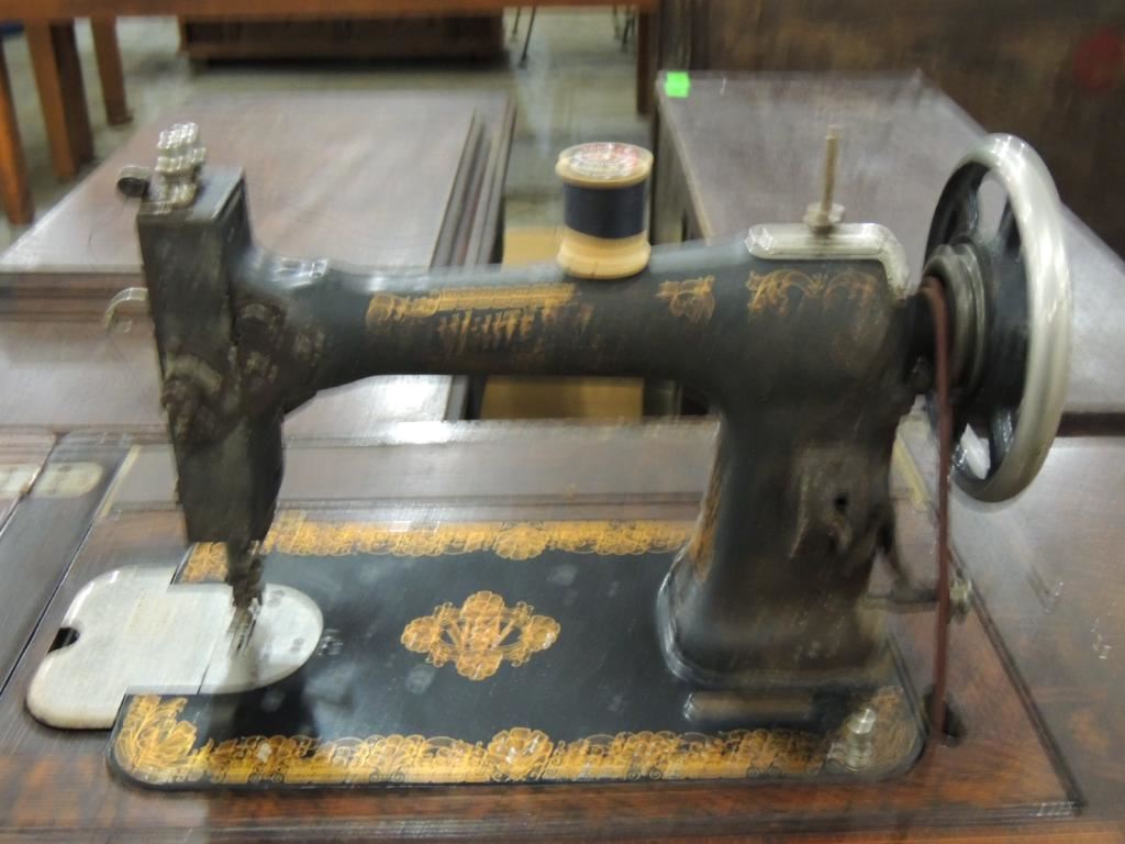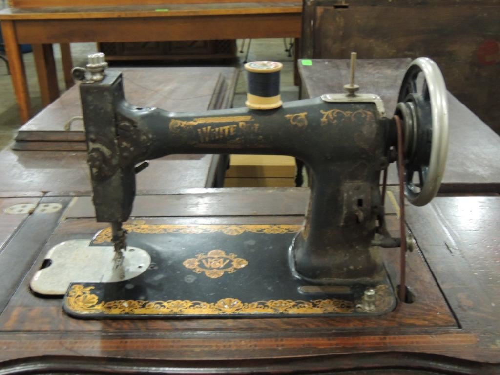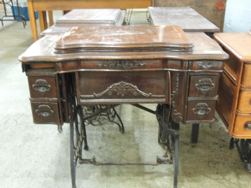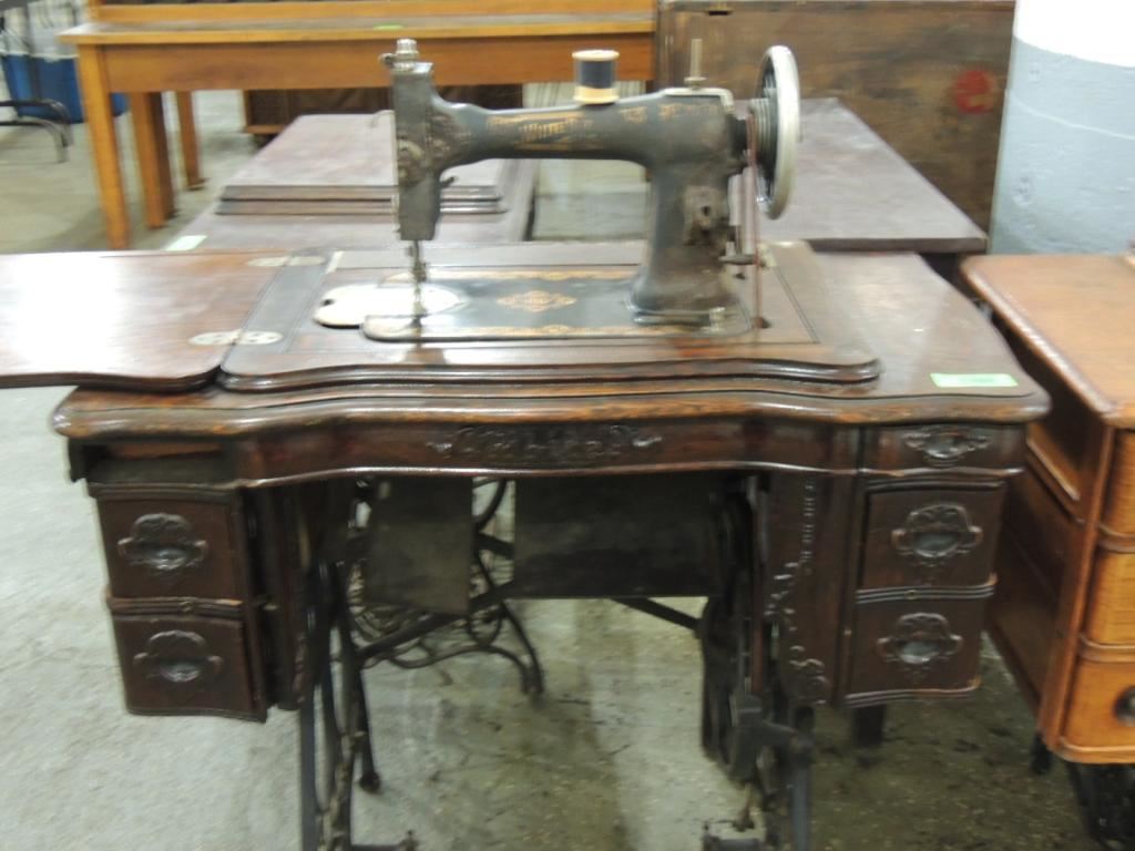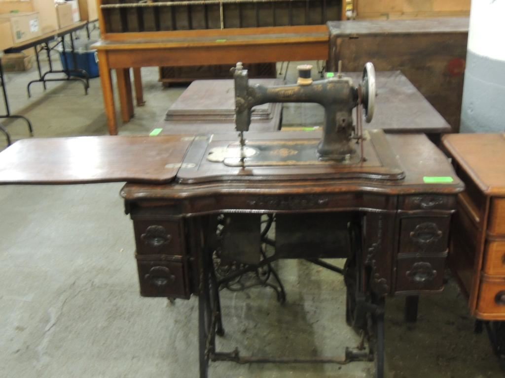 ANTIQUE SEWING MACHINE, CAST IRON BASE, FOOT PEDAL, SEWING MACHINE AND TABLE, STORAGE, ANTIQUE, GOOD CONDITION, COLLECTIBLE AS SHOWN SEE PHOTO FOR MORE DETAILS.
