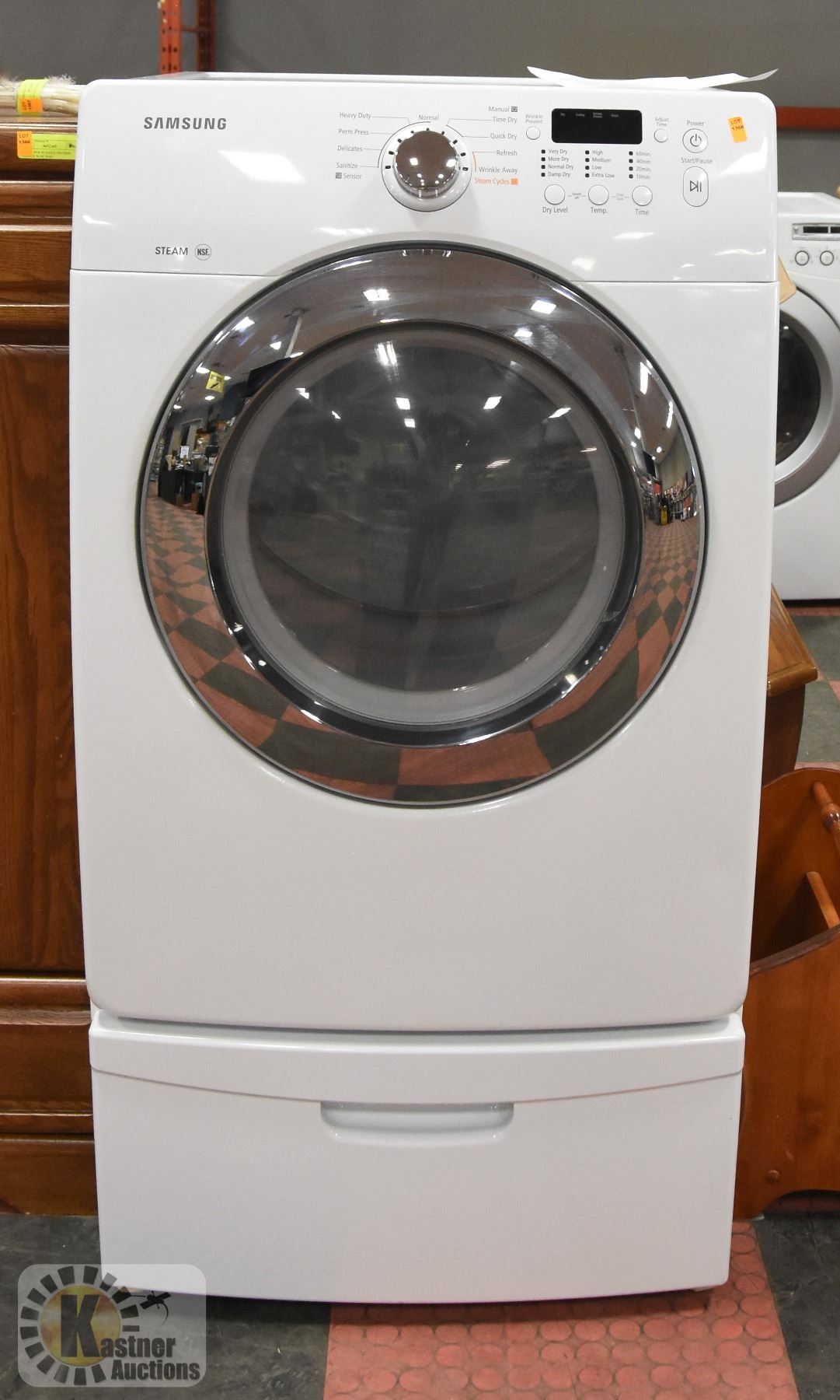 WHITE SAMSUNG STEAM FRONT LOAD DRYER W/PEDESTAL