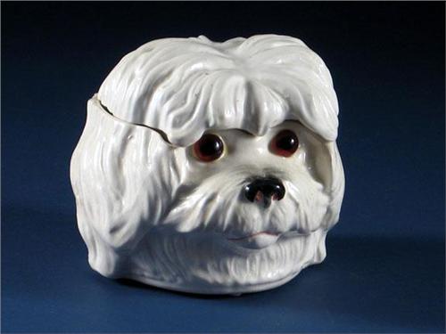 PORCELAIN HUMIDOR: A porcelain tobacco jar/humidor, a figural representation of a white terrier dog, attached glass eyes, unattributed, ill-fitting lid, 5 1/2'' x 5'', some casting flaws and crazing noted.