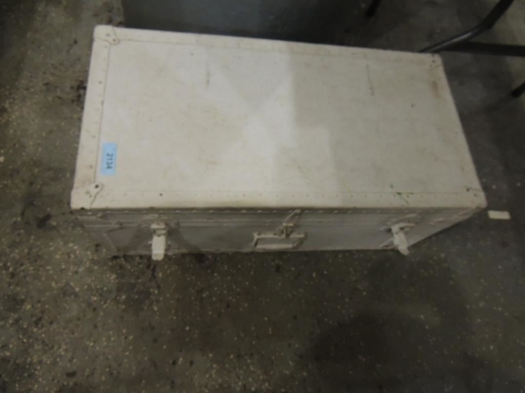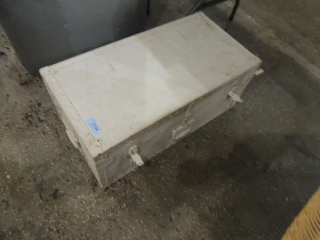 WHITE STORAGE TRUNK, FOOT LOCKER, DECORATIVE, STORAGE TRUNK, AS SHOWN SEE PHOTO FOR MORE DETAILS.