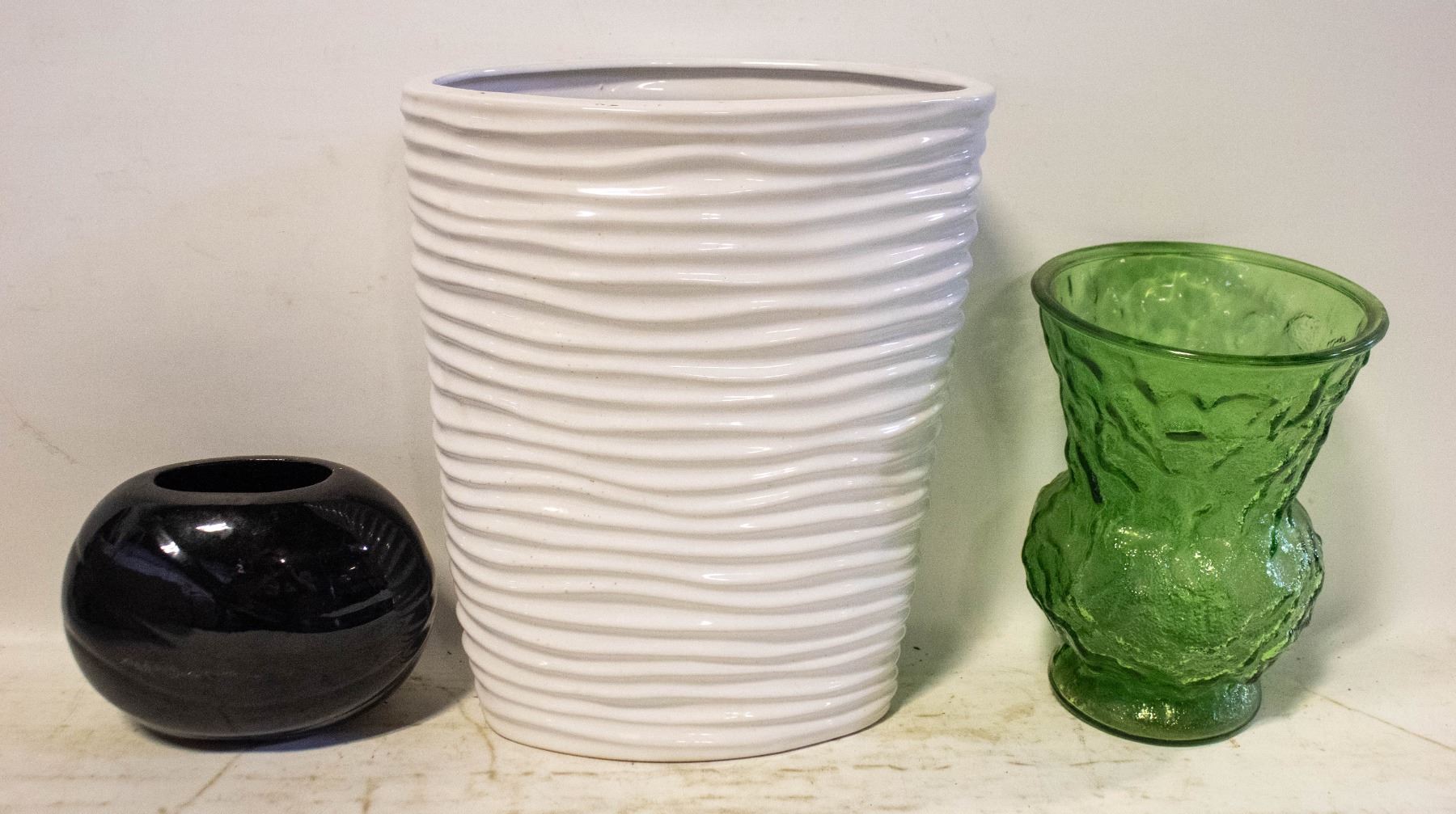 PLANTER + SMALL BLACK CERAMIC VASE + GREEN ART GLASS VASE TOGETHER **ALL ITEMS MUST BE REMOVED BY 5PM SATURDAY, JUNE 14TH 2025. ALL REMAINING ITEMS WILL BE SUBJECT TO A $6.00 PER DAY STORAGE CHARGE. ANY ITEMS REMAINING AFTER MONDAY, JUNE 30TH, 2025 WILL BE CONSIDERED FORFEITED. NO REFUNDS WILL BE ISSUED FOR FORFEITED ITEMS. TO SCHEDULE A PICK UP APPOINTMENT CLICK HERE