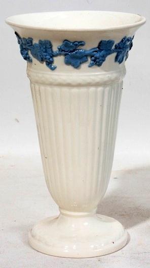 WEDGWOOD QUEENSWARE PORCELAIN VASE H 6 1/2in. Vase is white with a blue accent