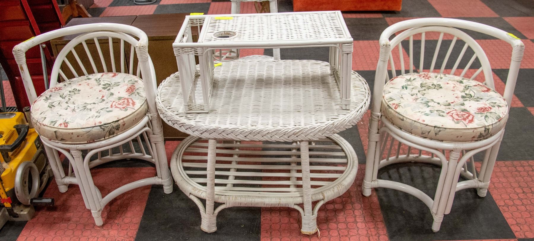 PORTABLE TV DINNER TRAY, MATCHING WHITE WICKER PLANT STAND + REAL PLANT IN POT