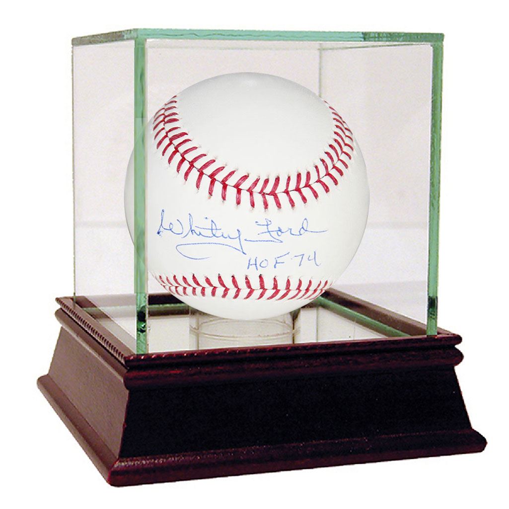 WHITEY FORD NEW YORK YANKEES AUTOGRAPHED MLB BASEBALL I **|**|** Edward 'Whitey' Ford's control and precision as pitcher of the New York Yankees is what led team manager Casey Stengel to refer to him as the 'money pitcher.' The eight-time All-Star won 10 of his 22 World Series appearances the most pitcher appearances ever and earned the Cy Young Award in 1961. 'The Chairman of the Board' a nickname given to him for confidence and intelligence on the mound was inducted into the Baseball Hall of Fame in 1974. This Whitey Ford autograph is guaranteed authentic