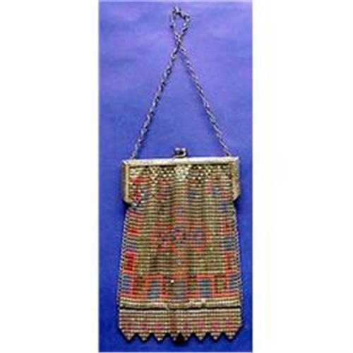 Gorgeous original Whiting and Davis antique metalic mesh flapper style purse, This is quite unique piece with Art Deco design and a lovely shades of blue,red and silver ground. In excellent condition, Love the petit ambossed floral pattern on the frame which is signed on inside with famous Whiting & Davis "signature".Very pretty chain handle.The purse is 6 1/2 inches by 5 inches wide. Buyer please pay 6.00 for ship. plus insurance if desired - Thanks for looking!