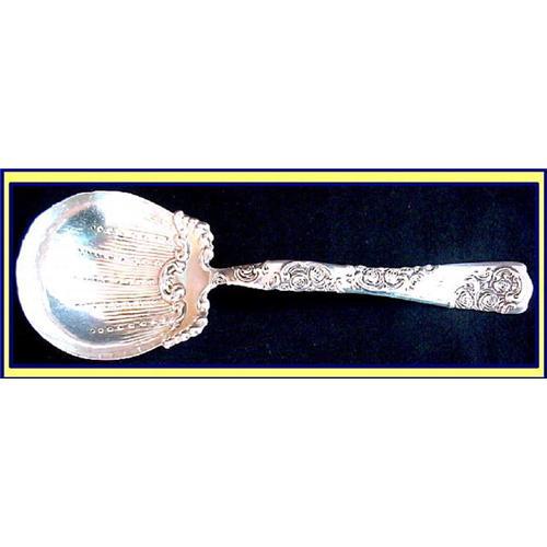 Whiting Manufacturing Company sterling silver berry serving spoon. Made 19th century before the company was taken over by Gorham. <BR>Measures 8 3/4inches and weighs about 4oz.<BR>Large berry spoon. The ruffle-edged deep bowl with raised scrolls, ridges and circles. The handel is richly decorated with repousse roses and scrolls. A delicate monogram near the edge with GWB initial. Fabulous quality work. <BR>Back has the company symbol and STERLING embossed. <BR>Very good condition. <BR>M Dolan in her book American Sterling Silver Flatware has this to say pg 210: The silver flatware of this company is still monumentally underpriced and when prices begin to reflect true value, both actual and historic, it will probably be too late to begin a collection. This company really represents the pot ofsilver at the end of the rainbow.