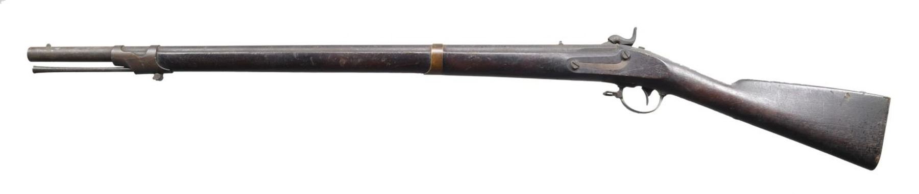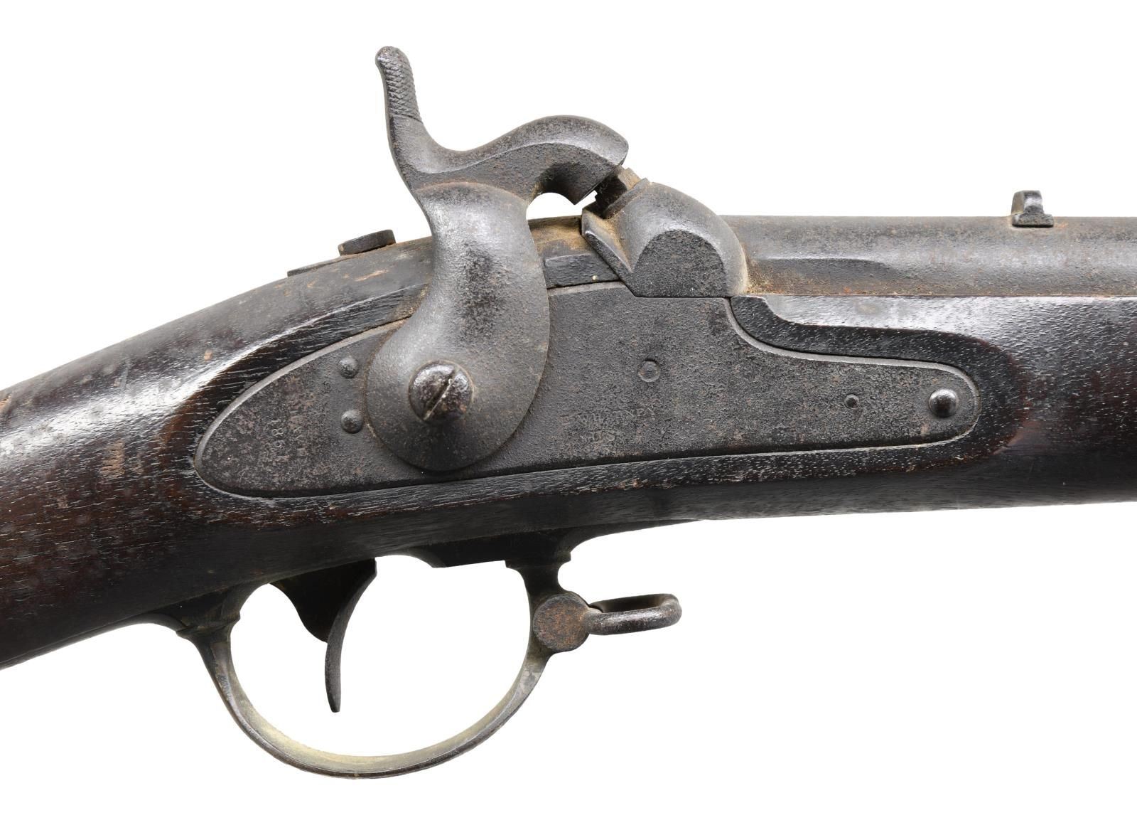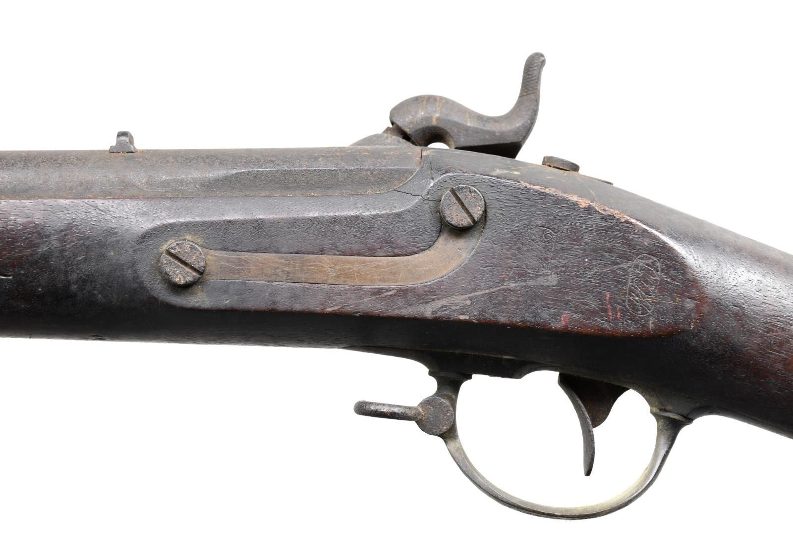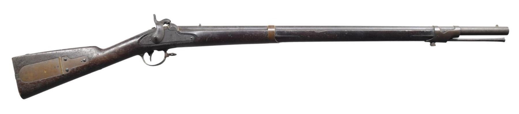 Cal. 58. NSN. Bbl. 33" rnd . Brass blade front sight w/ fixed rear sight. 1851 dated lock. 2 Band fastened walnut stock. Button tip ramrod. Left ear of stock has 2 lightly visible cartouches. Brass fittings consist of buttplate, patchbox, sideplate, trigger guard & 2 bbl. bands. Total of 26,500 mfg. 1843-55. CONDITION: metal has dark brown appearance w/ general pitting becoming heaviest in breech area. Stock has added finish over age darkened appearance showing scratches, dents & mildew spots. Lock has very stiff operation. Pitted bore w/ partially intact rifling. (01-24504/DS). ANTIQUE. $500-800.