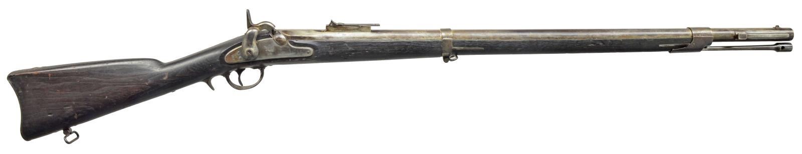 Cal. 69. S# 6011. Bbl. 34" rnd. bbl. w/ bayonet mounting stud on right front. Standard configuration, 3 groove rifling & long range ladder sight. Breech area is dated 1863 on top flat w/ “V”, “P” & eagle proofs on left flat. The number “6011” is on tang to match Collins supplied bayonet (not present). Ramrod is of correct type. Second style lock plate is dated 1863 on tail, has eagle over “U.S.” at center & is marked “WHITNEY-VILLE” under bolster. Trigger guard has finger spur. Rifle is complete furniture w/ “US” & “U” marks, inspector’s initials “FCW” (Frank C. Warner) are on left side. CONDITION: good overall. Metal parts considerably stained showing old cleaning, are mostly gray & brown patina. Stock w/ most of its dark original oil finish. Numerous scattered dents & marks. Inspector’s mark is clear. Shiny bore w/ scattered pitting. Lock is good. (01-18639/MGM). ANTIQUE. $1,500-2,500.