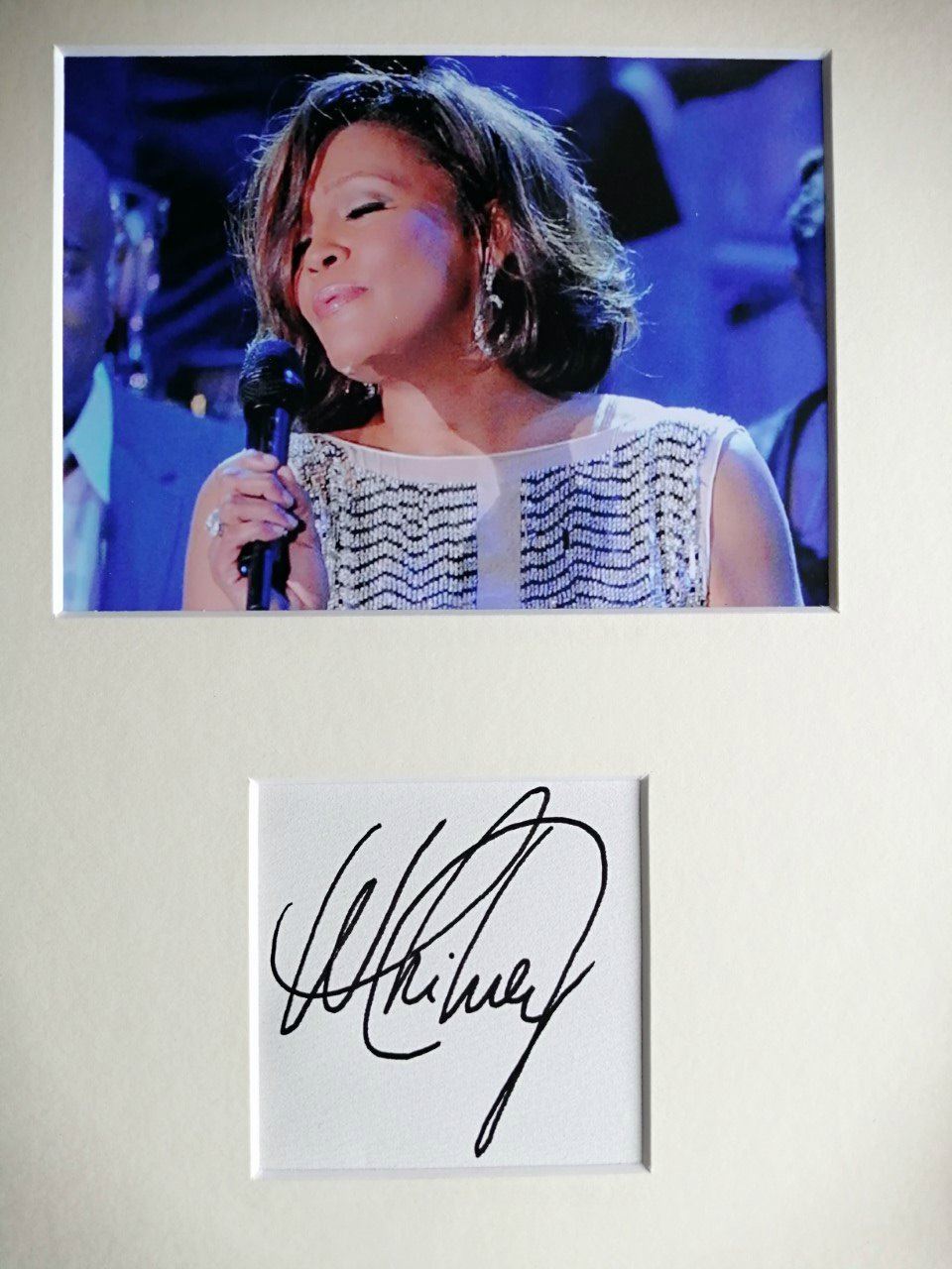 Whitney Elizabeth Houston was an American singer and actress. She was cited as the most awarded female artist of all time by Guinness World Records and remains one of the best-selling music artists of all time with 200 million records sold worldwide. A piece of paper autographed by Whitney Houston, mounted and framed.
