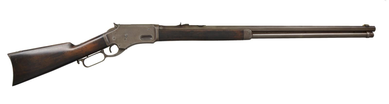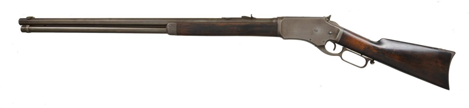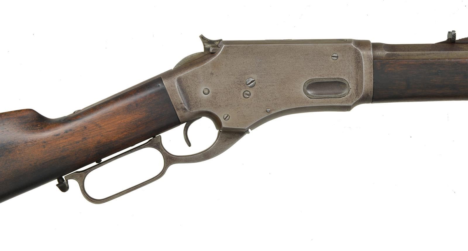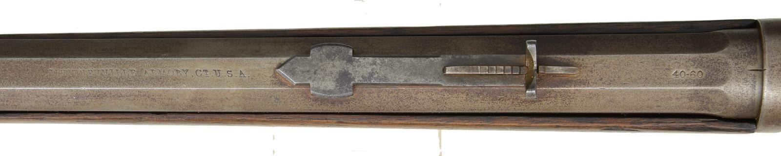 Cal. 40-60. S# M230. Bbl. 28" octagon. Top flat has one line Whitneville Armory address. German silver blade Rocky Mountain front sight with elevator adjustable sporting rear sight. Tubular mag. Walnut forearm and straight grip stock with crescent steel trapdoor buttplate. Estimated total production of 15,000 mfg. 1879-1886. CONDITION: metal has cleaned gray appearance showing general very light pitting. Wood has blotchy refinish showing dents, scratches and marks. Forearm has small cracks extending from action and cap. Dark bore retains sound rifling showing spots of pitting. Hammer follows when lever is closed. Shortened hammer spur has 2 holes possible extension. (01-21688/DS). ANTIQUE. $1,500-2,000.