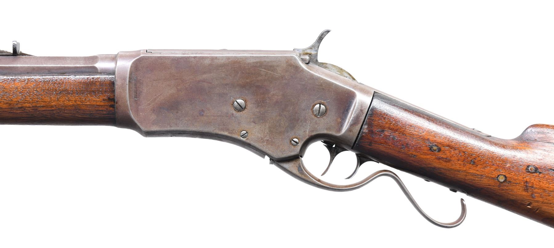 Cal. 44-40. S# 2965. Bbl. 28" octagon. German silver blade rocky mountain front sight w/ sporting rear sight. Full length mag. Double set triggers. Forearm & straight grip walnut stock w/ crescent trapdoor buttplate. Estimated production of 15,000 mfg. 1879-1886. CONDITION: metal finish has faded to gray/brown. Forearm shows spots of heavy wear that may be from use w/ cross sticks. Stock is broken through wrist w/ nail type repairs. Sound action & triggers. Bore shows darkening close to the muzzle w/ remainder retaining intact rifling. (01-26451/DS). ANTIQUE. $2,000-3,000.
