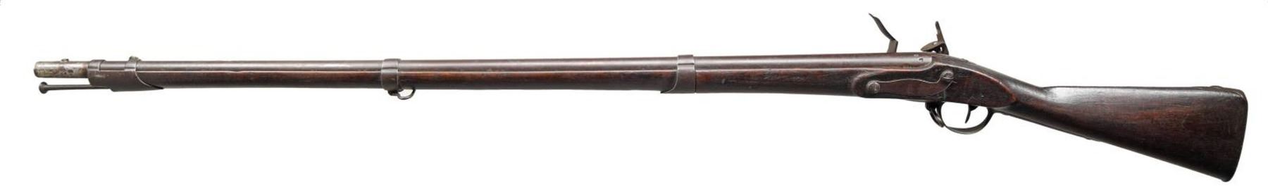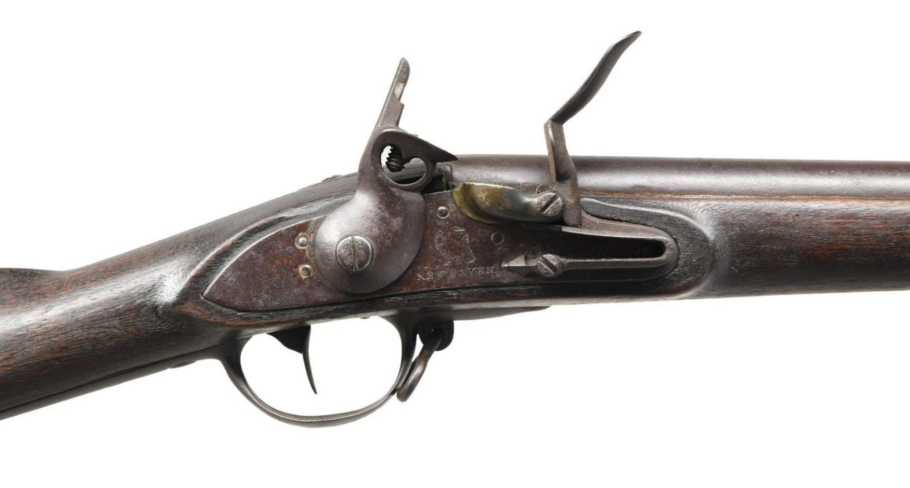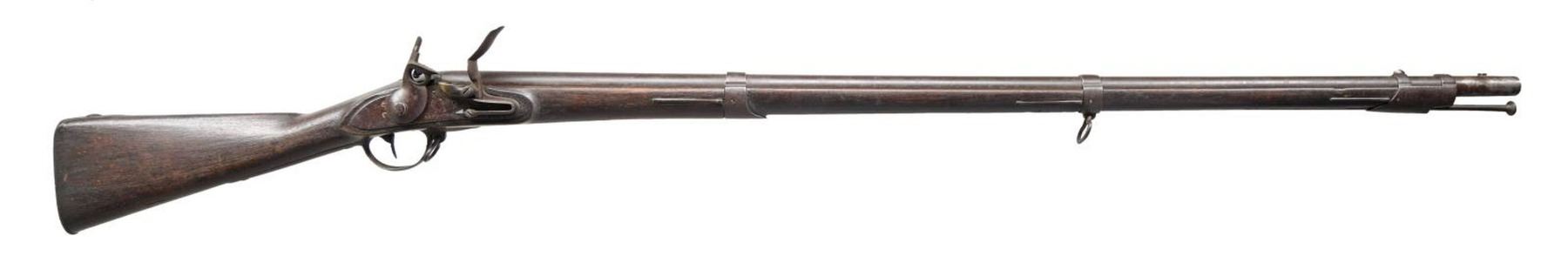 Cal. 69. NSN. Bbl. 42". Blade front sight. Bayonet stud 1 1/4" behind muzzle. Top of bbl. marked "N.Y.". Bbl. also marked w/ a circled "P" proof & a deep stamping that appears to be a heart. Lock marked w/ an eagle over "NEW HAVEN". Walnut stock w/ three bands & bottom mounted sling swivels. Left side of walnut stock has circular NY acceptance cartouche that reads "V/BY/I.M". Trumpet shaped ramrod present. Bottom of stock has two large carved sets of initials ahead of trigger guard. CONDITION: stock shows a few chips in ramrod channel, scattered dings & handling wear. Metal is a dull gray patina w/ oxidation throughout. Top of hammer is broken. Oxidized bore. (01-23839/MJC). ANTIQUE. $500-700.