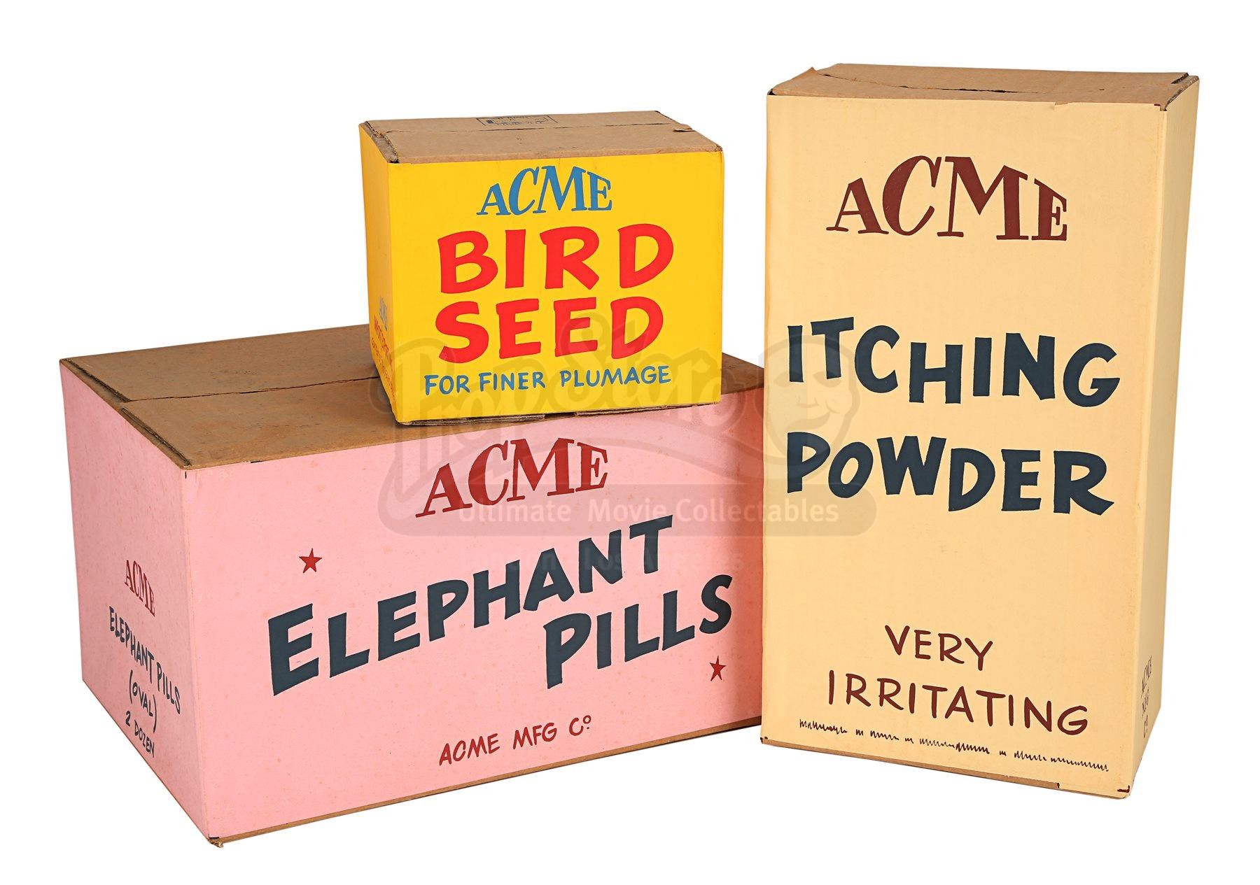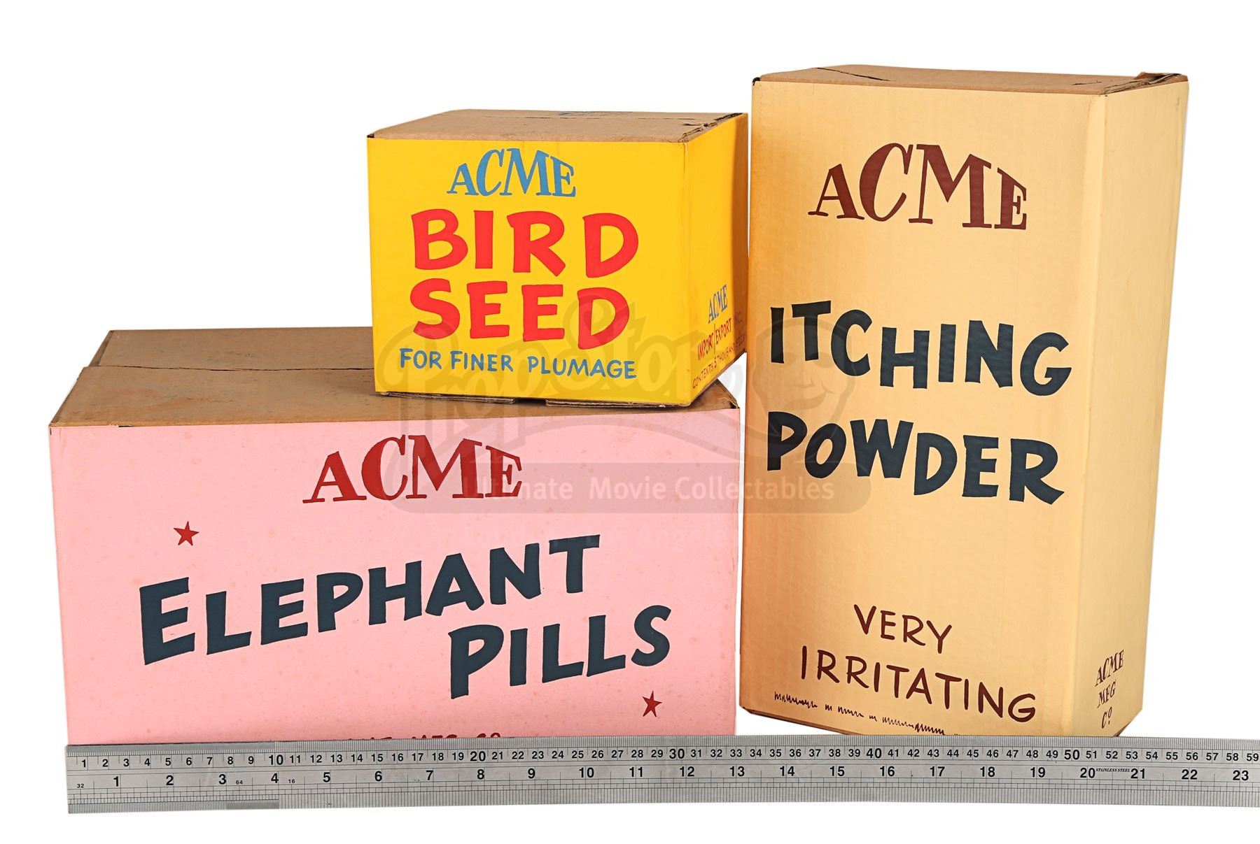 The set includes three decorated cardboard boxes in varying sizes, with printed paper labels covering their sides. The cartoonish products include “Elephant Pills” on a pink background, “Itching Powder” on cream and “Bird Seed” on yellow. All include “Acme” brand labels. The boxes show minor tears, creases and stains throughout. Dimensions (largest box): 33.5 cm x 25 cm x 20 cm (13 ¼” x 10” x 8”)