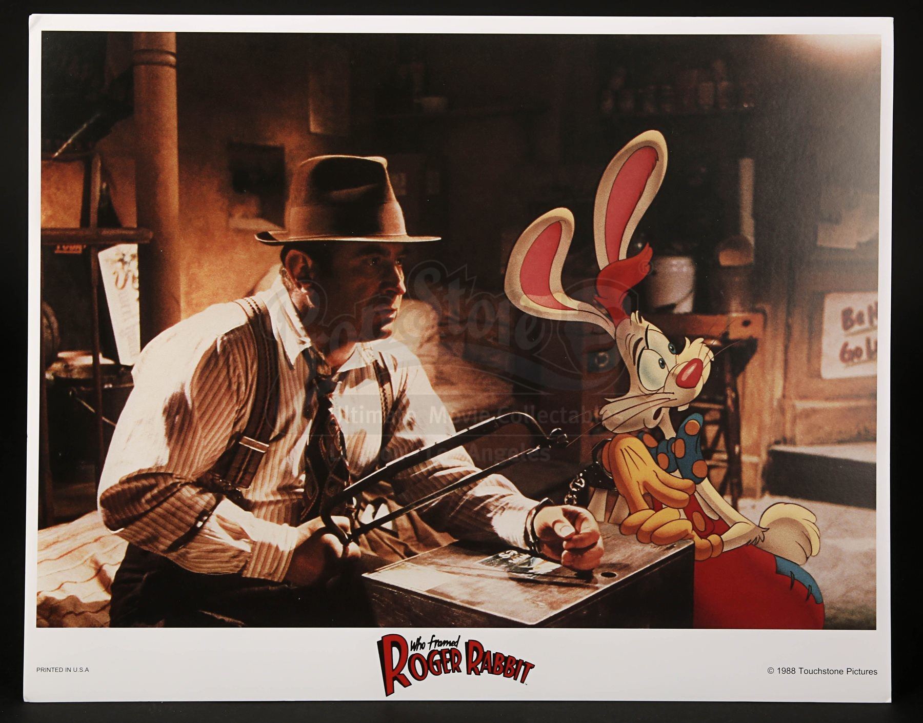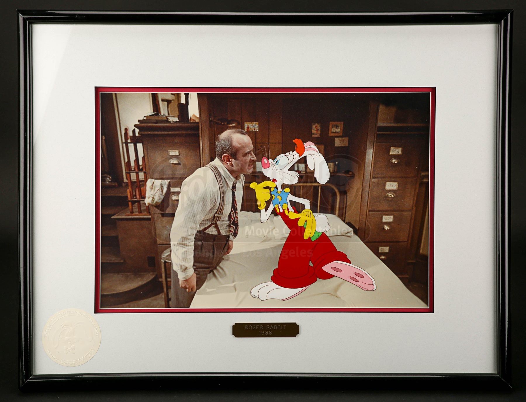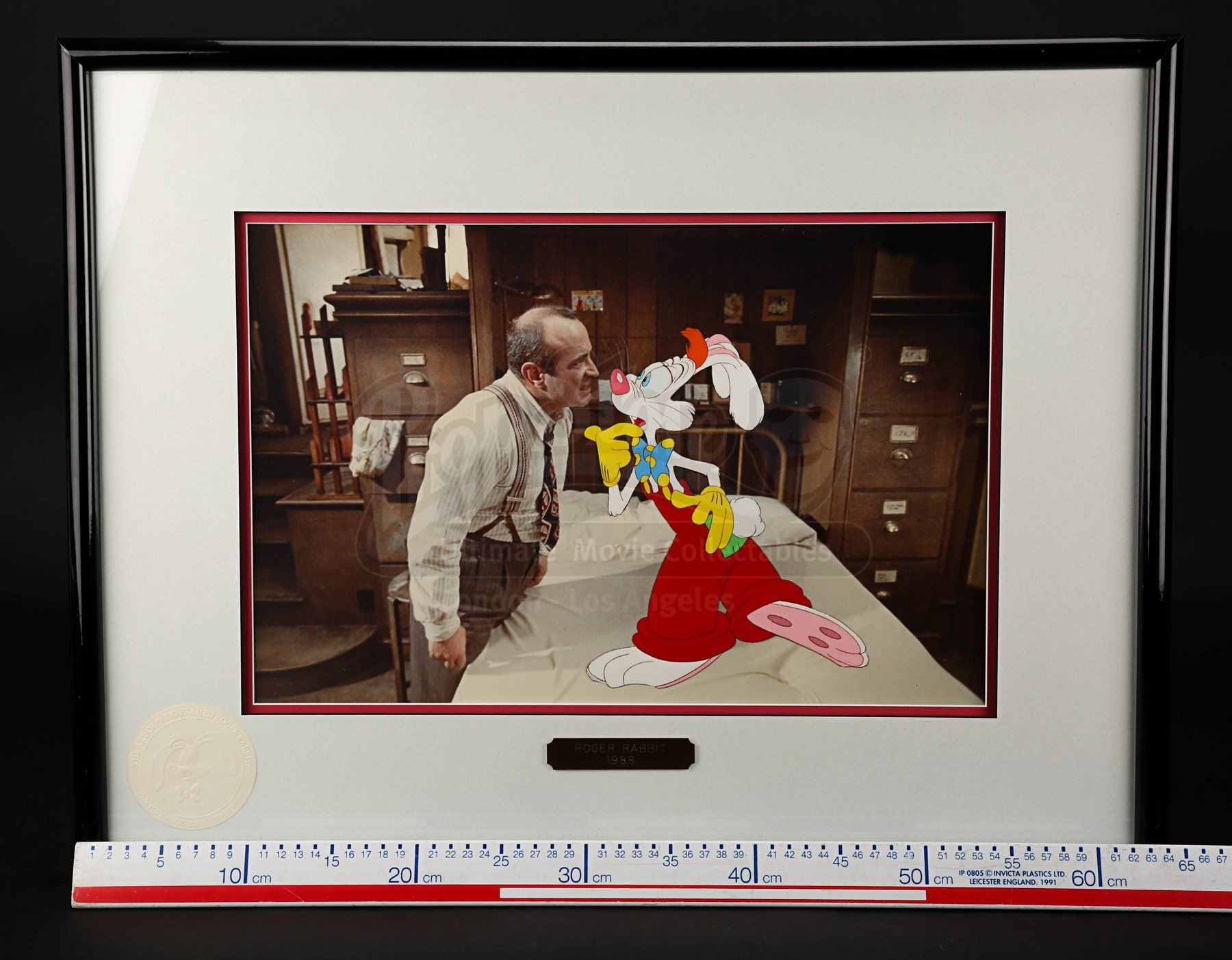 The cel was originally purchased in the 1989 Sotheby's auction "The Art of Who Framed Roger Rabbit", and is accompanied by a copy of the auction catalogue and a letter of authenticity from Walt Disney Studios. A set of six lobby cards accompany the lot, with one featuring the exact same image. The frame shows minor scratches and wear from storage. Dimensions: 3 cm x 65.5 cm x 50 cm (1 ¼” x 25 ¾” x 19 ¾”)